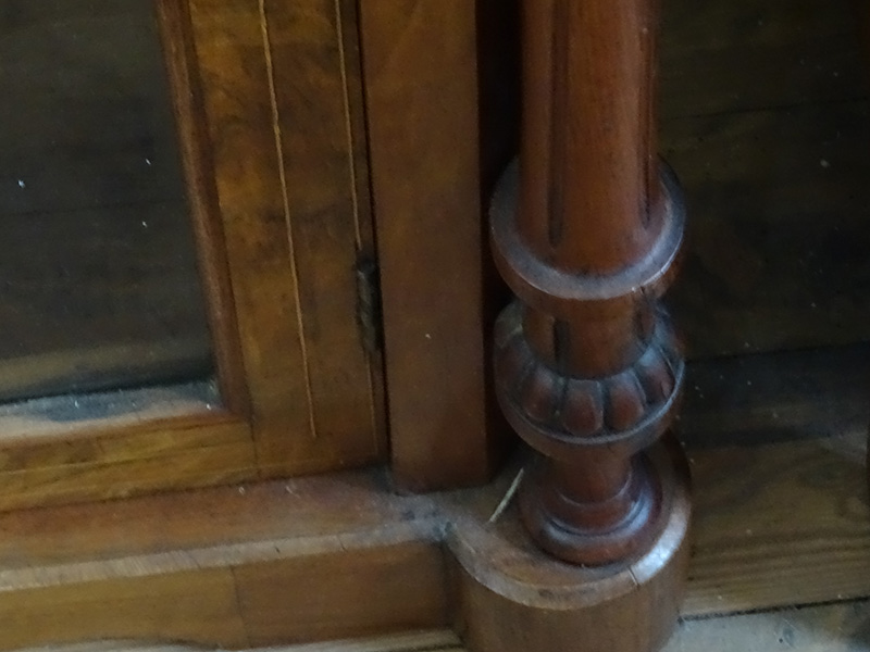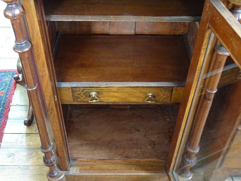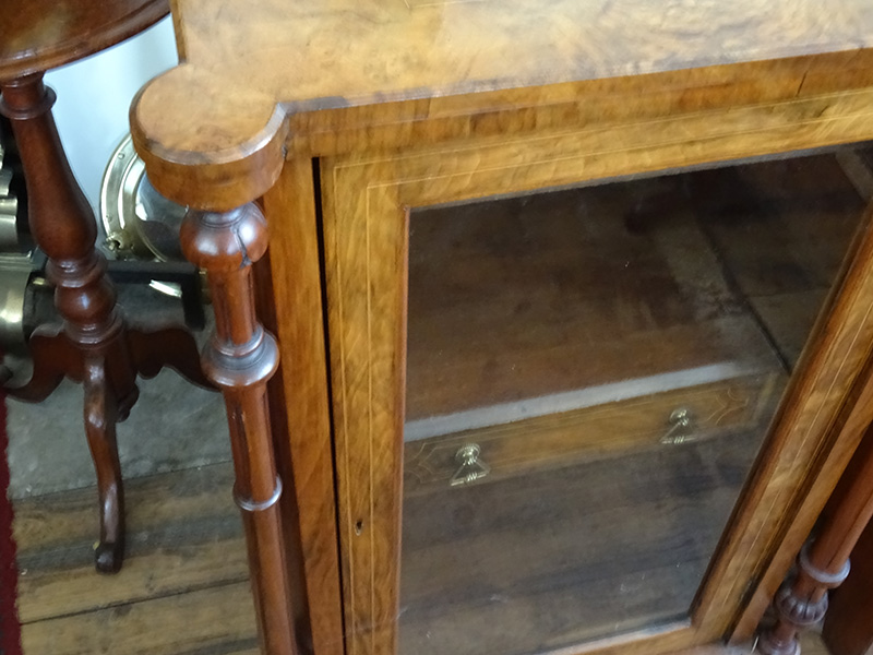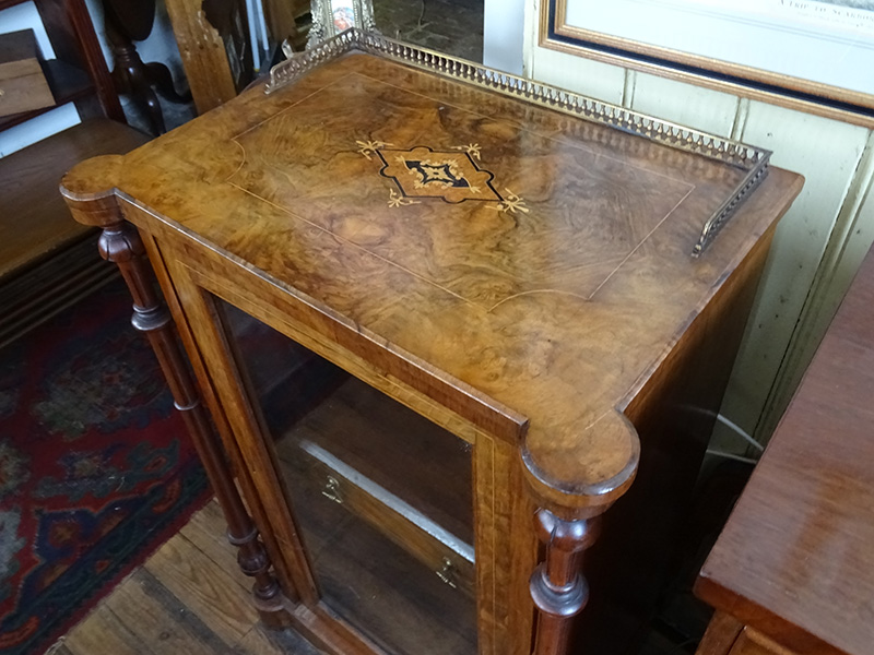 Here is a good quality glazed cabinet from the Victorian period, having pierced brass gallery allover satinwood stringing with pillars on the front. Excellent condition. Measure 36 inches high, 24 inches deep.