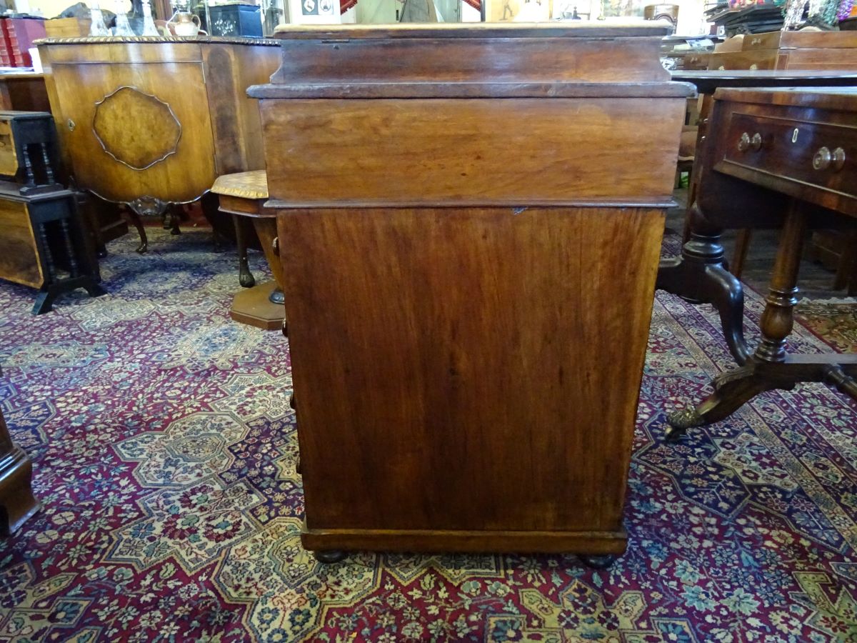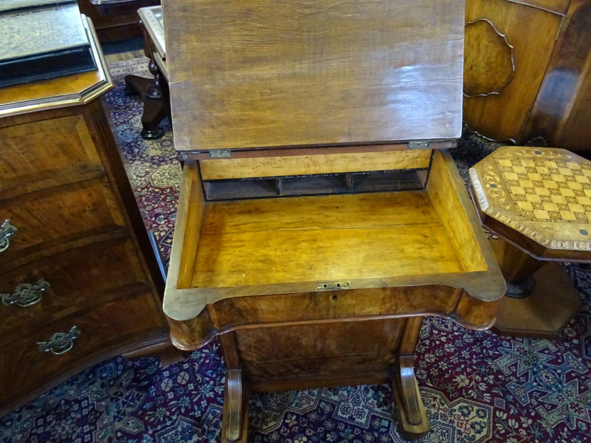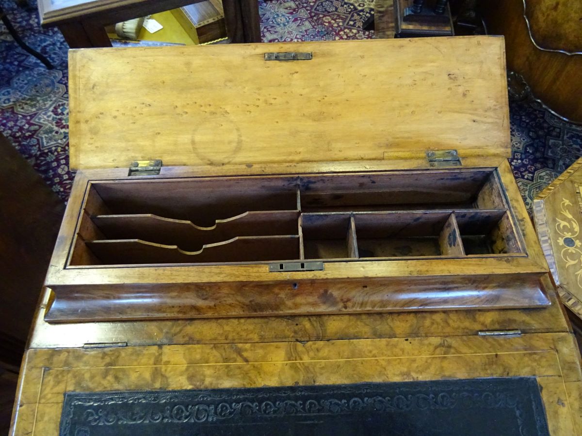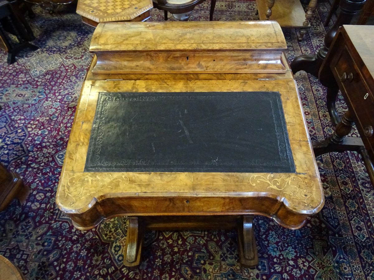 Here is a good satinwood strung burr walnut Davenport, top fitted with letter rack and inkwell, four short drawers with four dummy drawers on other side.
