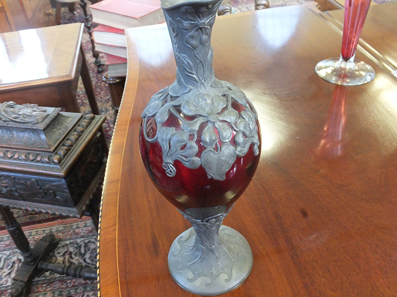 Here is a cranberry glass claret jug with pewter mounts from the Victorian period, stands 13.5 inches and is in good condition.
