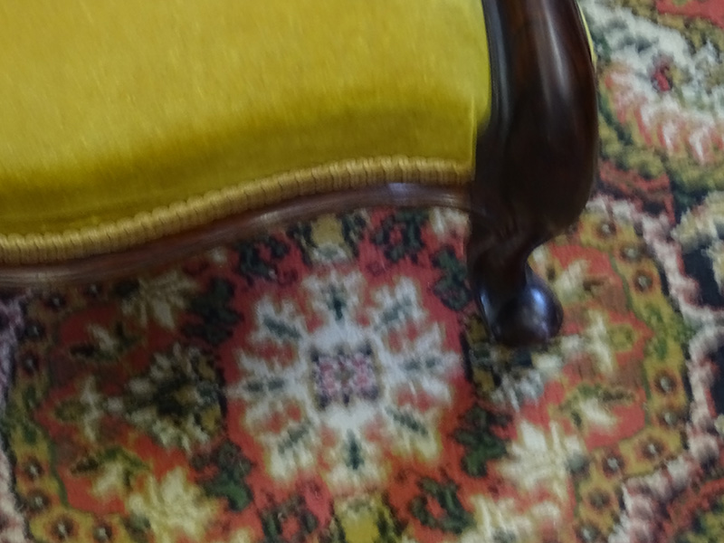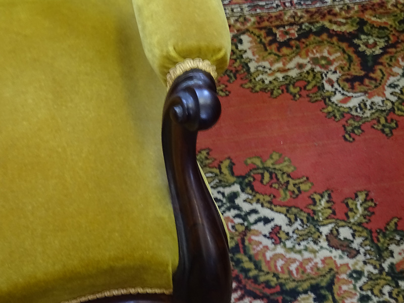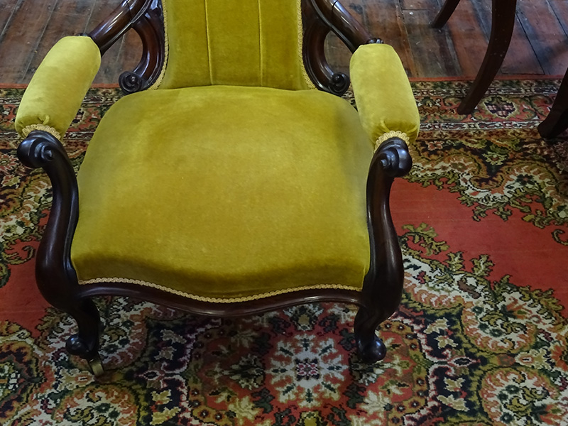 Here is an early Victorian gentlemans chair, the showwood is rosewood, and being a gents chair has elbows. Stands on castors. The upholstery is reasonable.