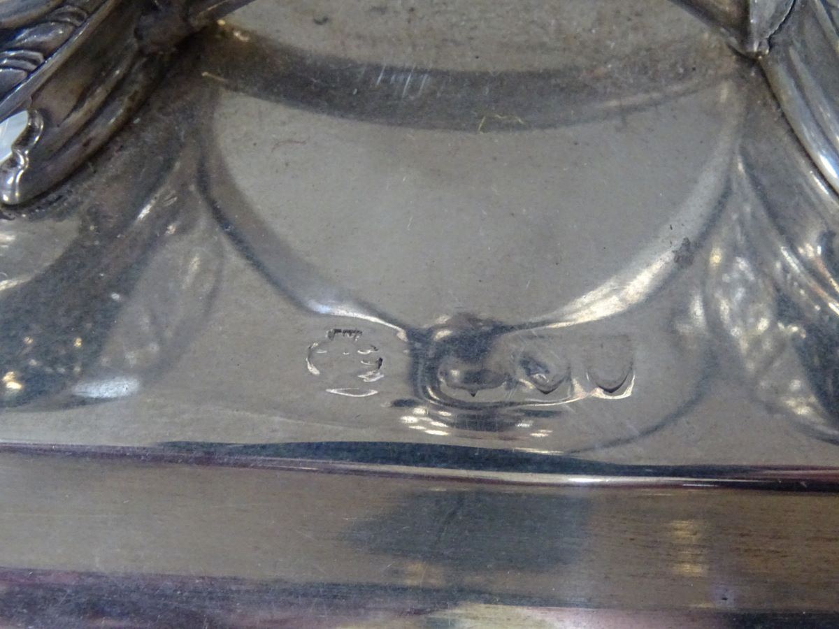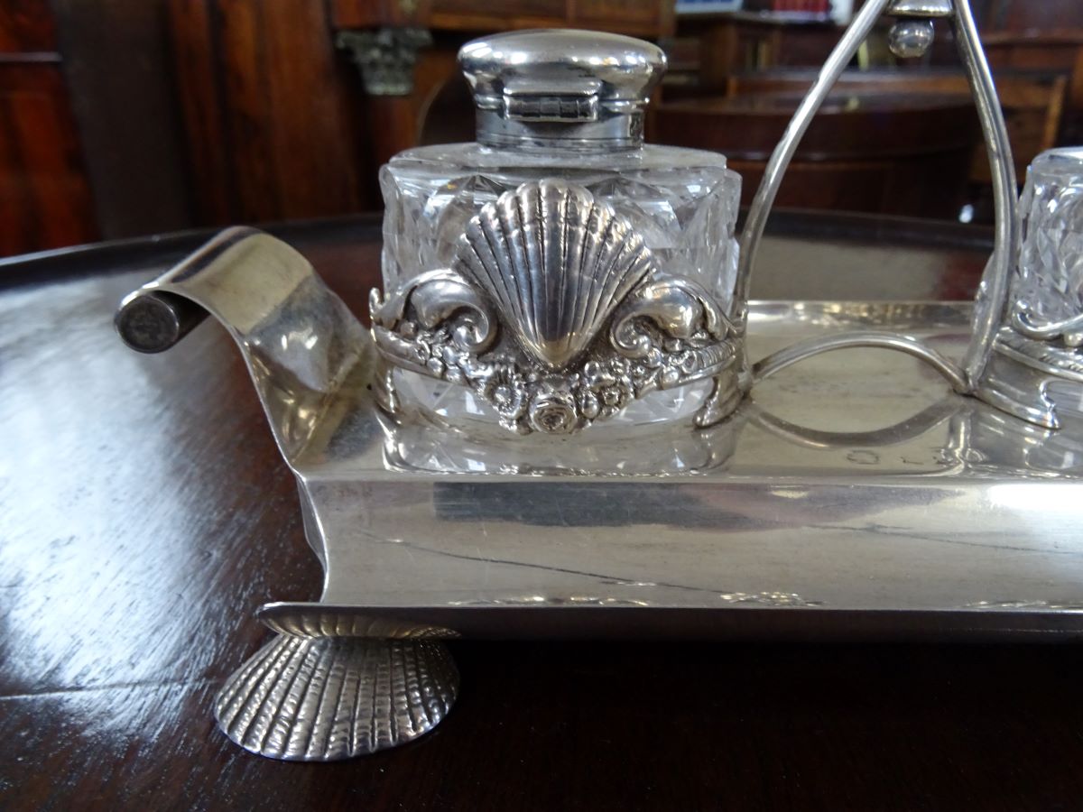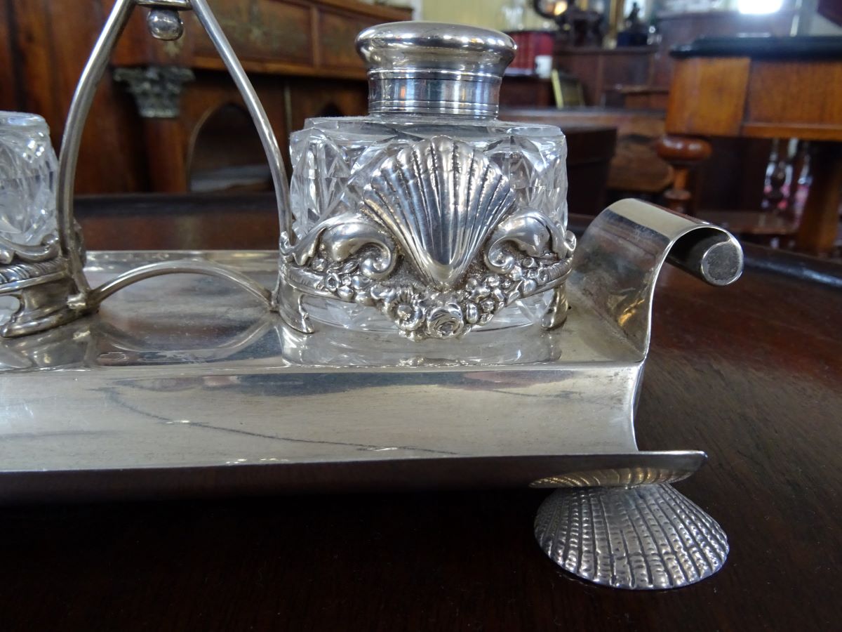 Here is a silver desk stand with centre taper stick, cutglass ink wells in cast shell holders on shell feet, by William Hutton & sons, London 1895. Good condition and measures 9 inches long.