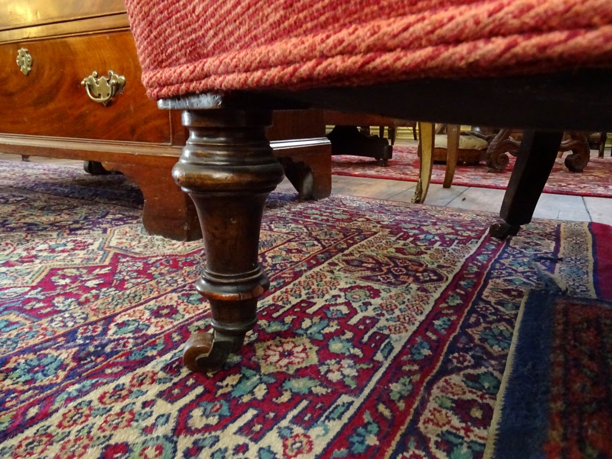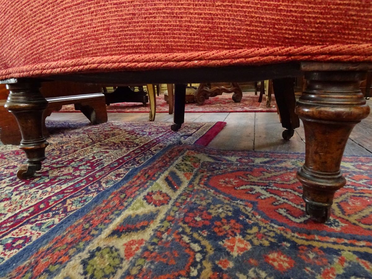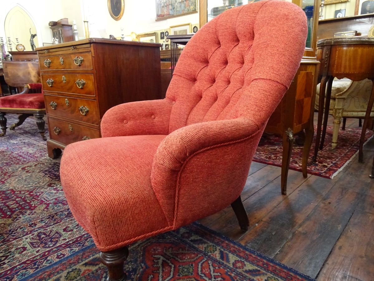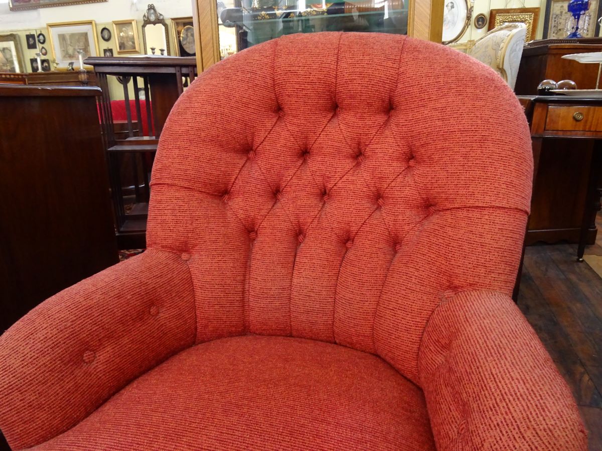 Here is a well upholstered fireside chair, upholstered in a terracotta fabric, button back and overstuffed seat. Stands on turned forelegs with castors. Excellent condition.