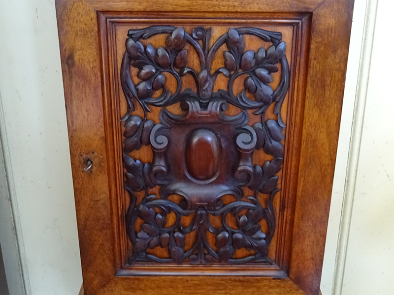 Here is a good 19th. century wall hanging cupboard, made from walnut, with carved pediment, carved panelled door. Excellent condition and measures 27.5 inches high and 13 inches wide.