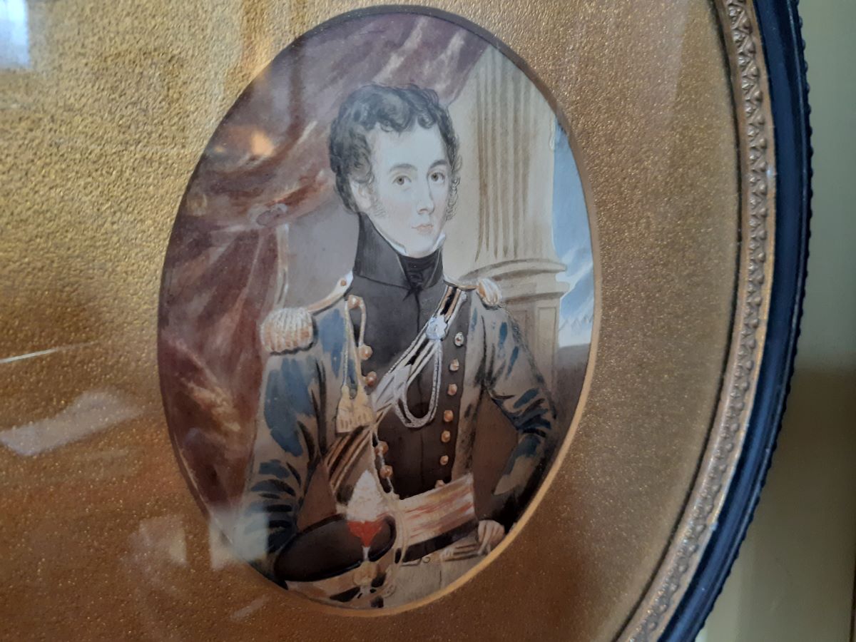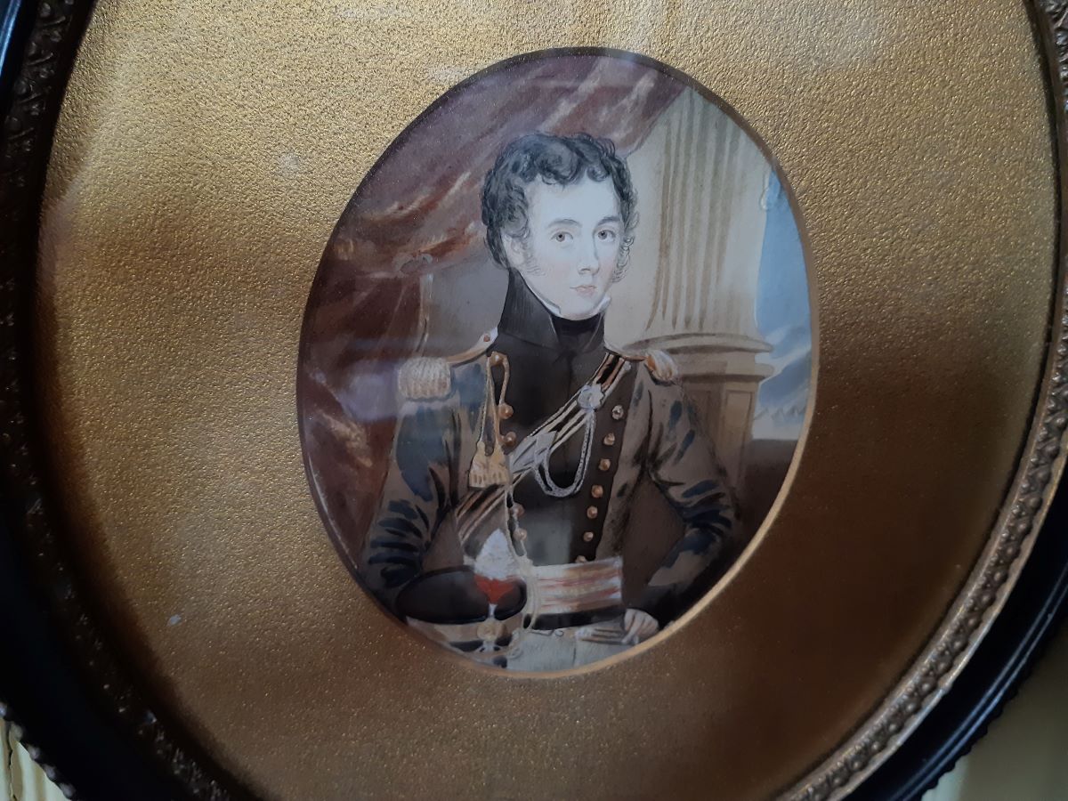 Here is a watercolour in oval ebonised frame of 'Ensign Newton at Waterloo', South Lincs regiment. Verso label on back of frame, which measures 12''.