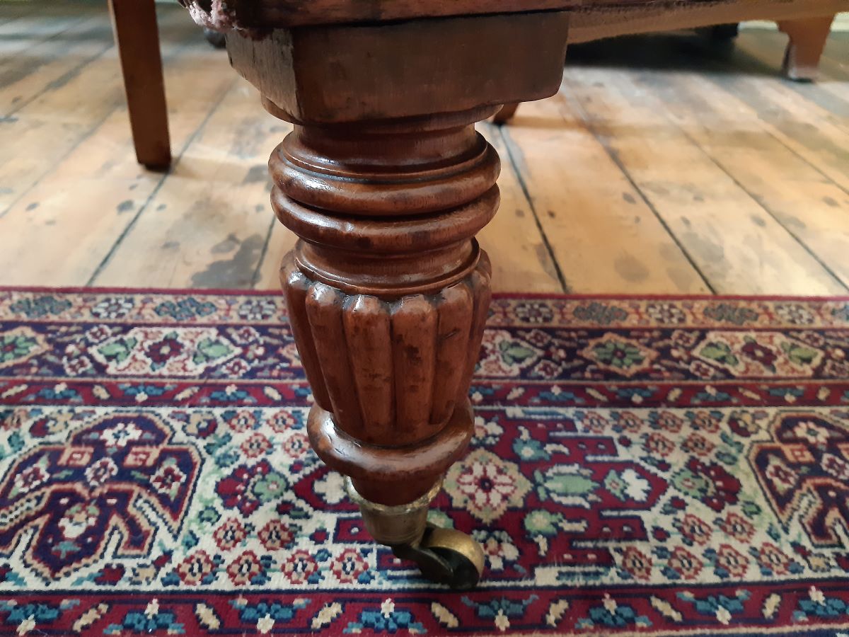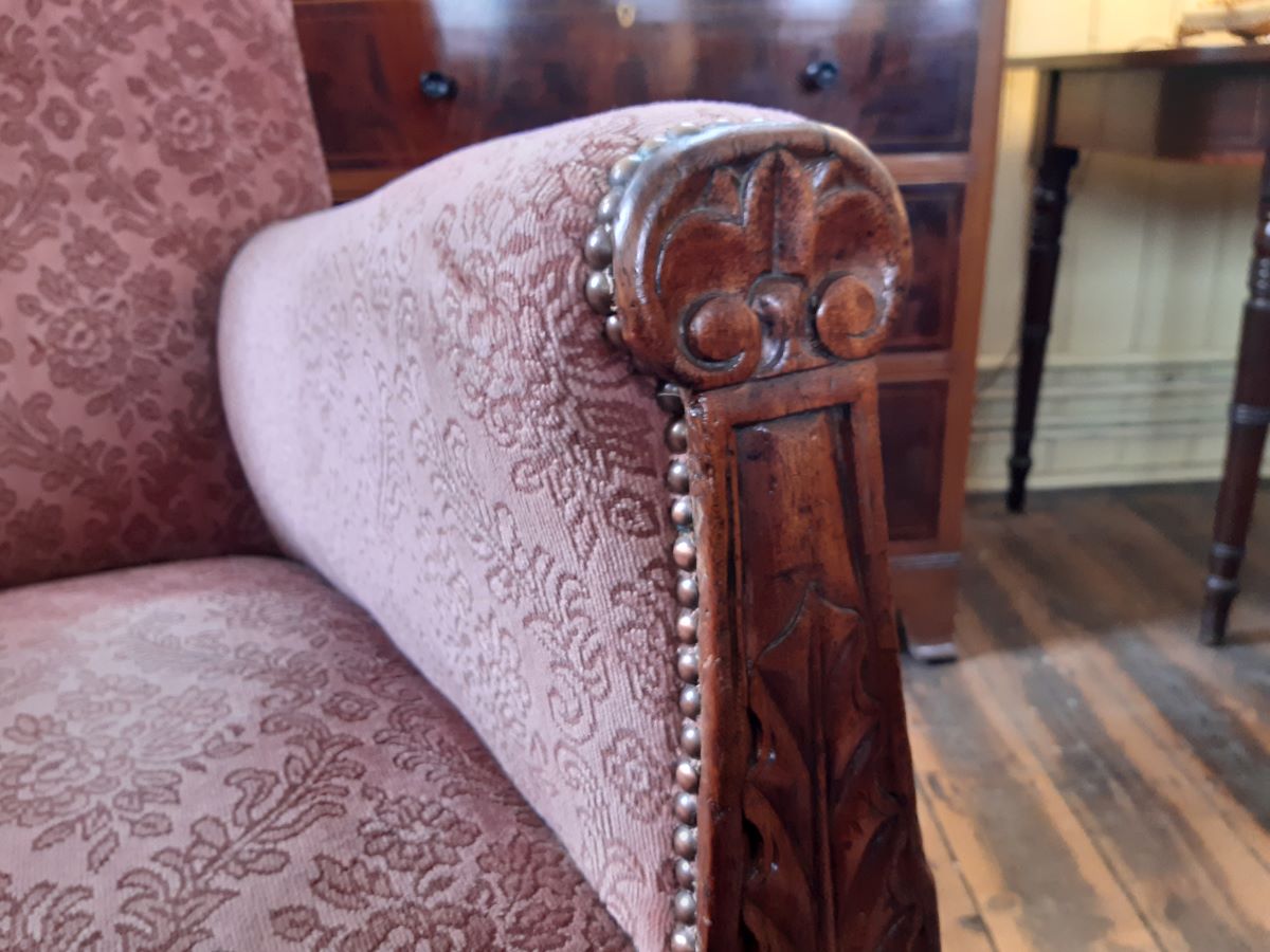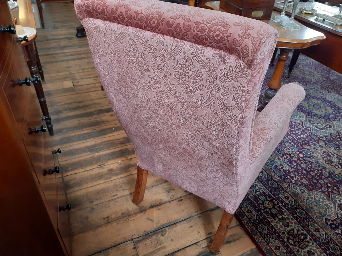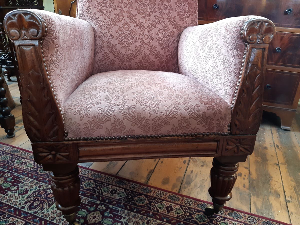 Here is an upholstered fireside armchair, with carved mahogany show wood front. From the William IV period, it measures 42'' high.