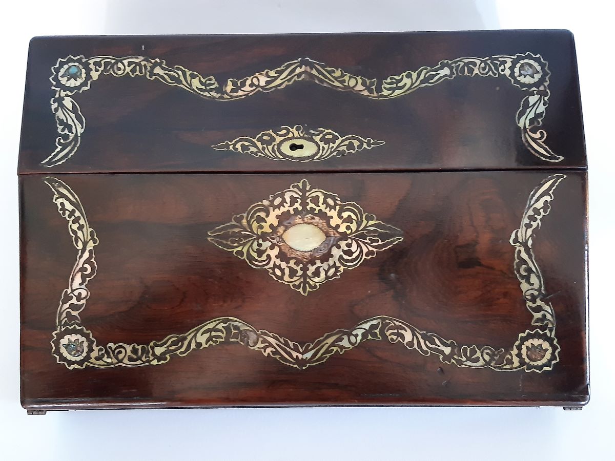 Here is a good rosewood writing slope, ornate mother of pearl marquetry inlay. Complete with original ink wells. Made in the 1830's it is in good condition.