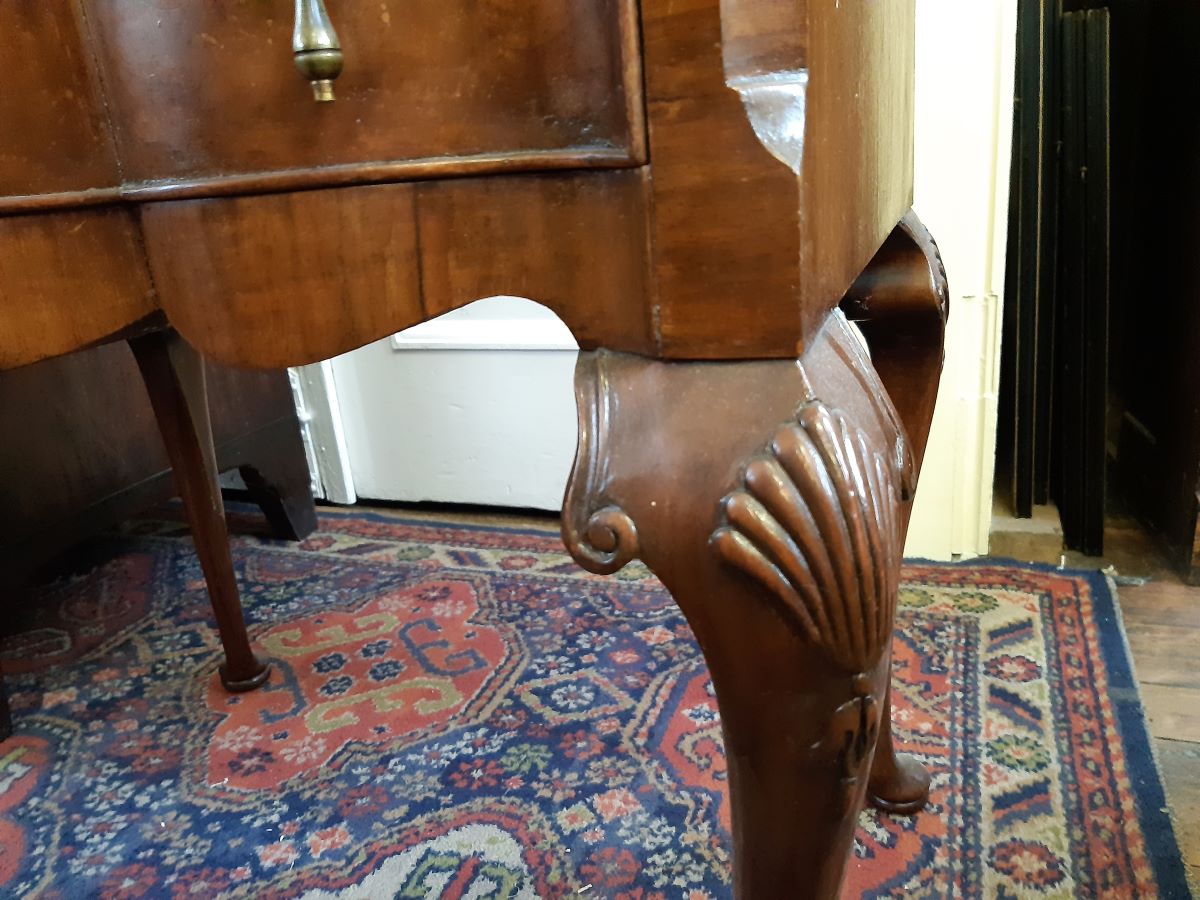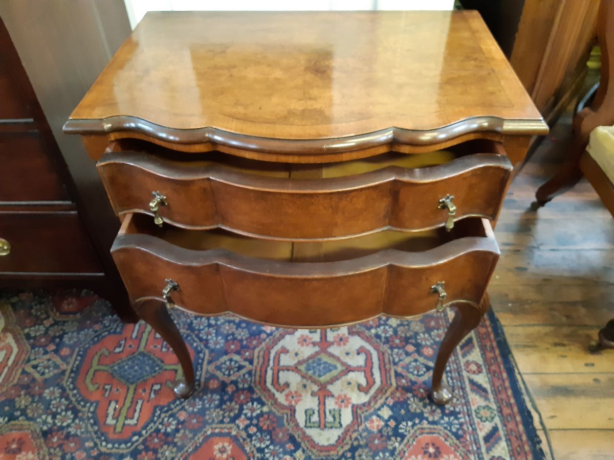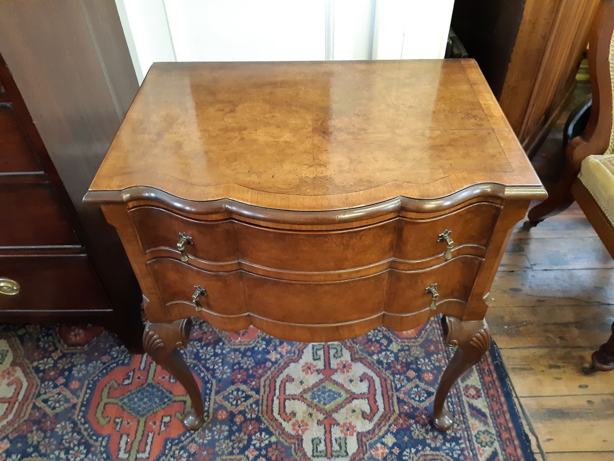 Here is a good quality 2 drawer chest, Burr walnut top, crossbanded. Shaped front, drawers fitted with brass drop handles. Stands on cabriole legs with shell motifs. Width 24'', 17'' deep & 28'' high.