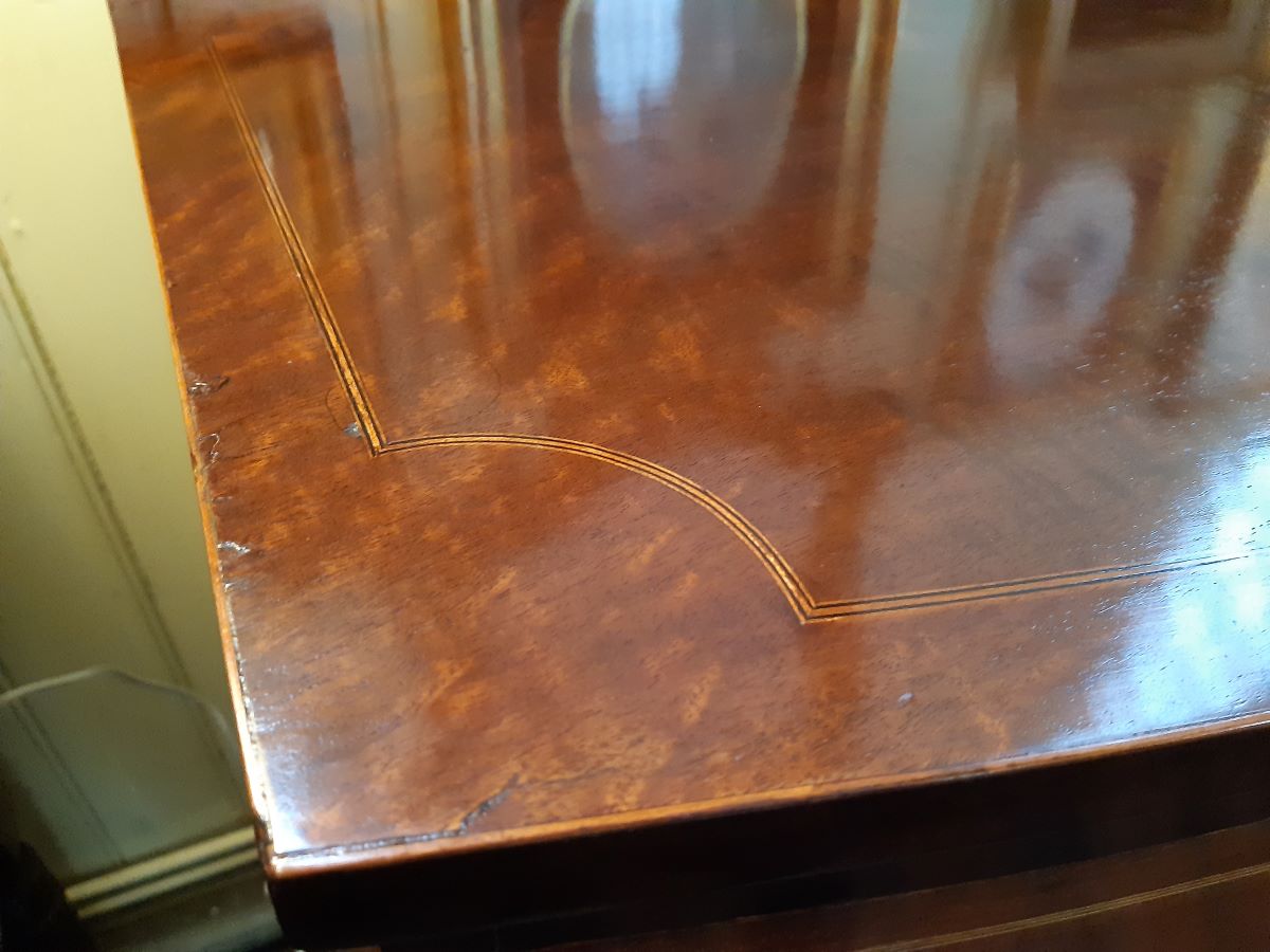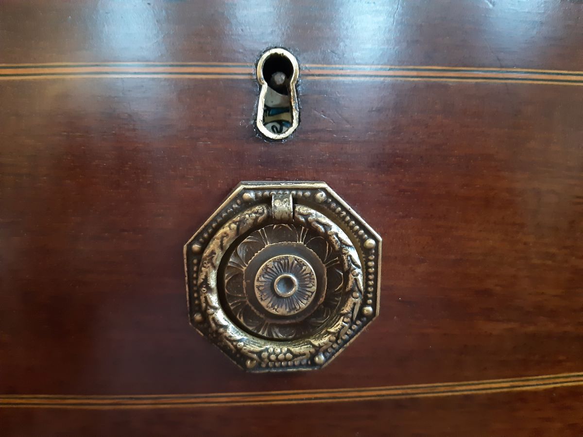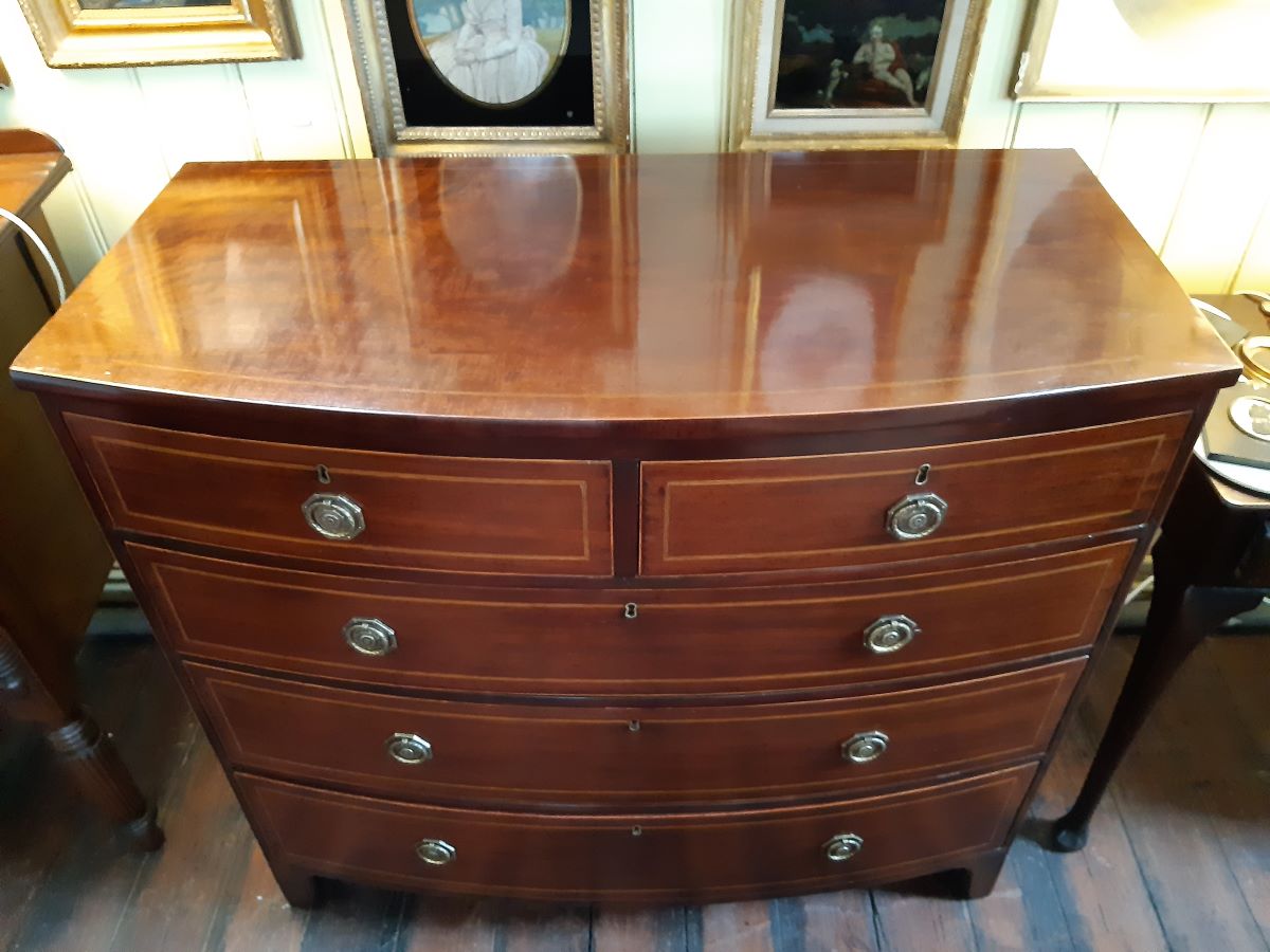 Here is a good mahogany bow front chest of drawers, with inlaid banding on the top and on the drawers which are fitted with good brass ring handles. From the early 1800's it is in excellent condition. Measurements: 3'5'' wide, 3'1'' high.