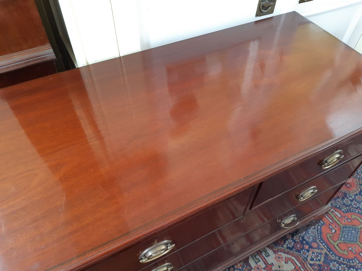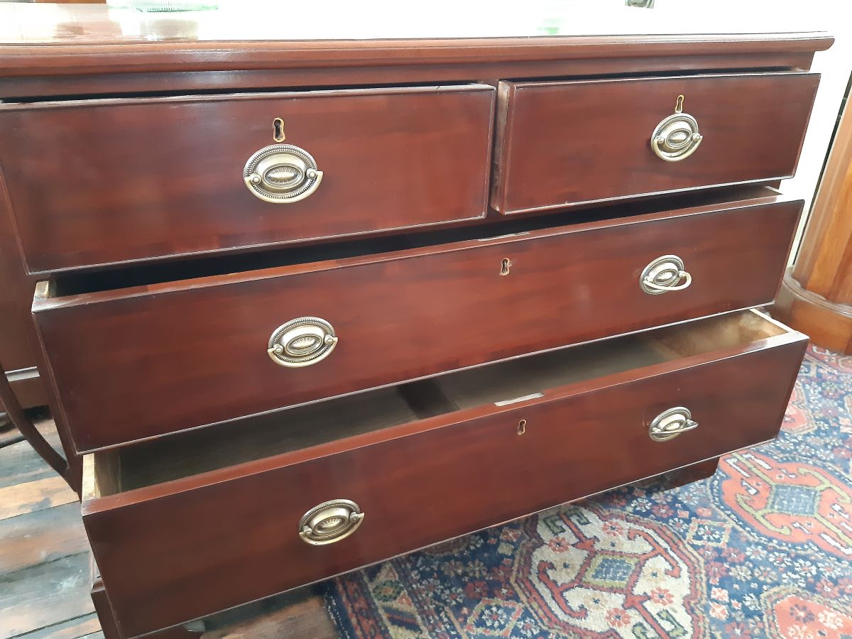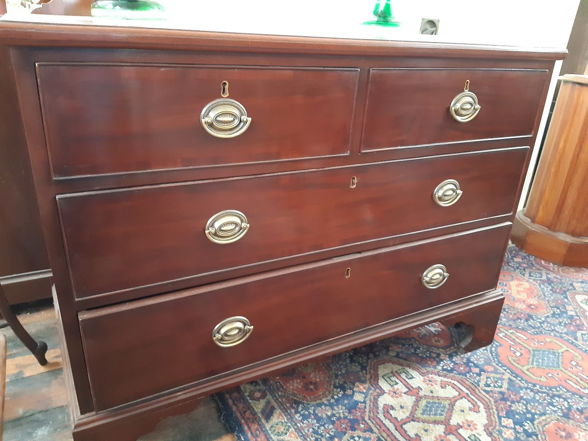 Here is a mahogany chest of 2 long and 2 short drawers with brass handles. From the 1830's it stands 32'' high, 43'' wide & 21'' deep.