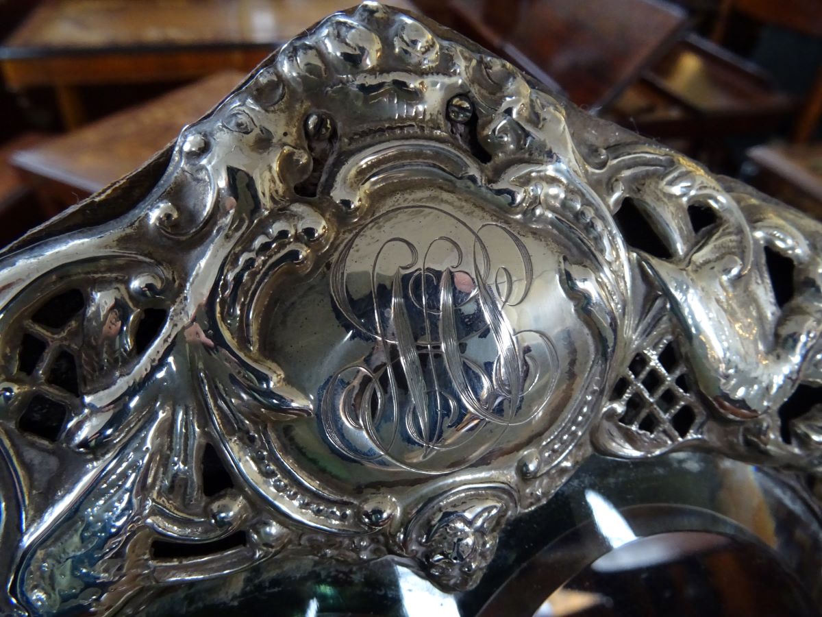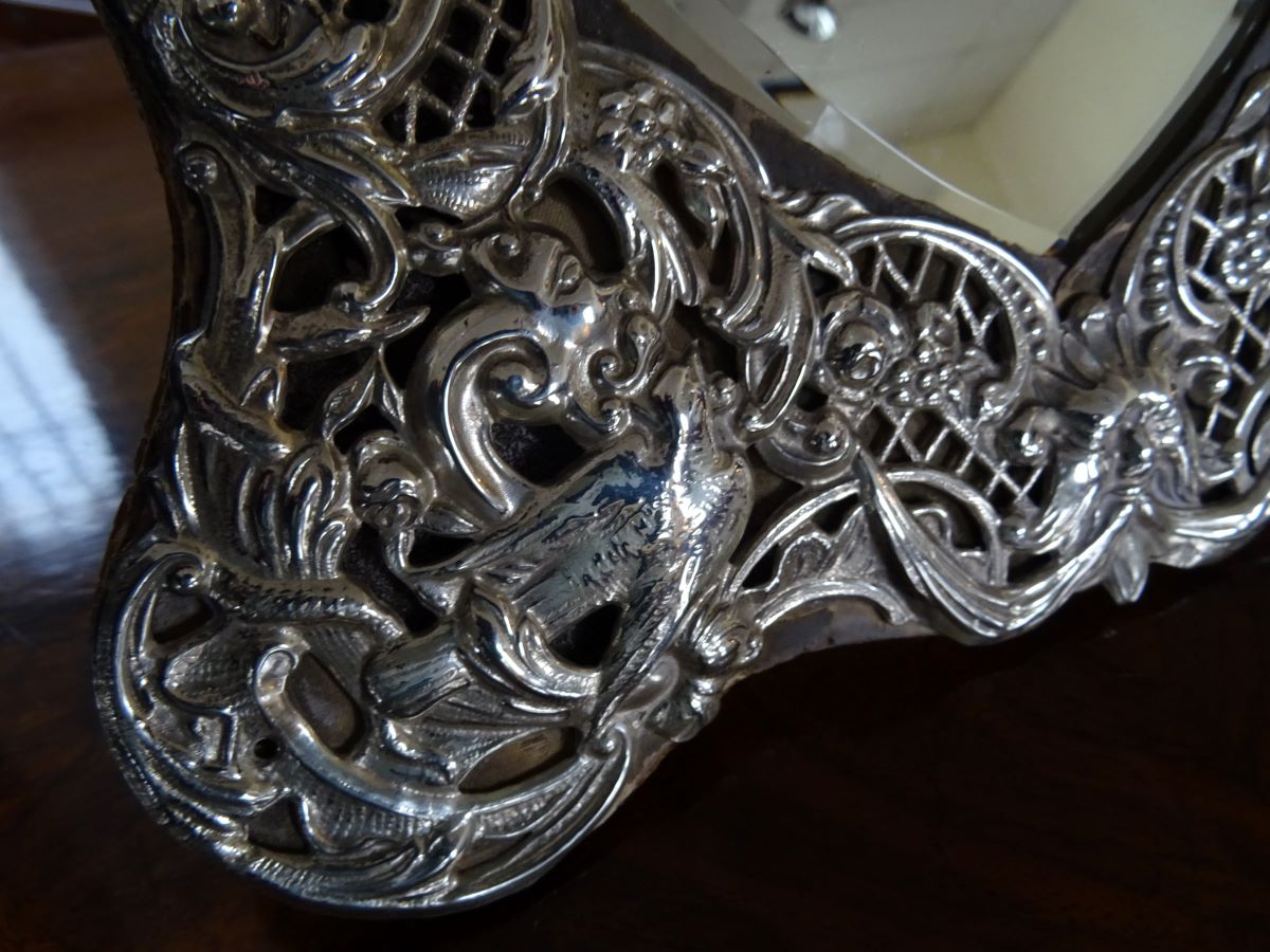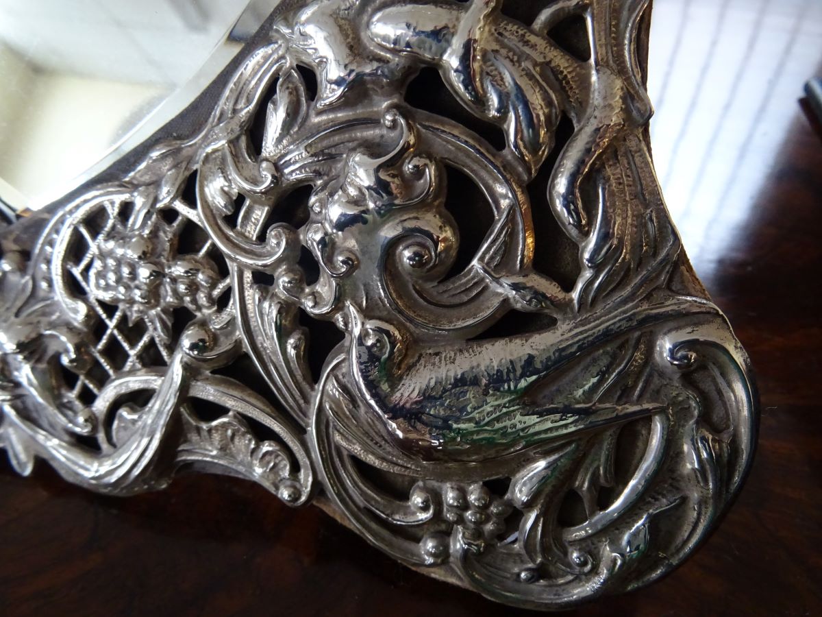 Here is a good silver fronted heart-shaped mirror, pierced and embossed bird and flower decoration. Measures 11'' high.