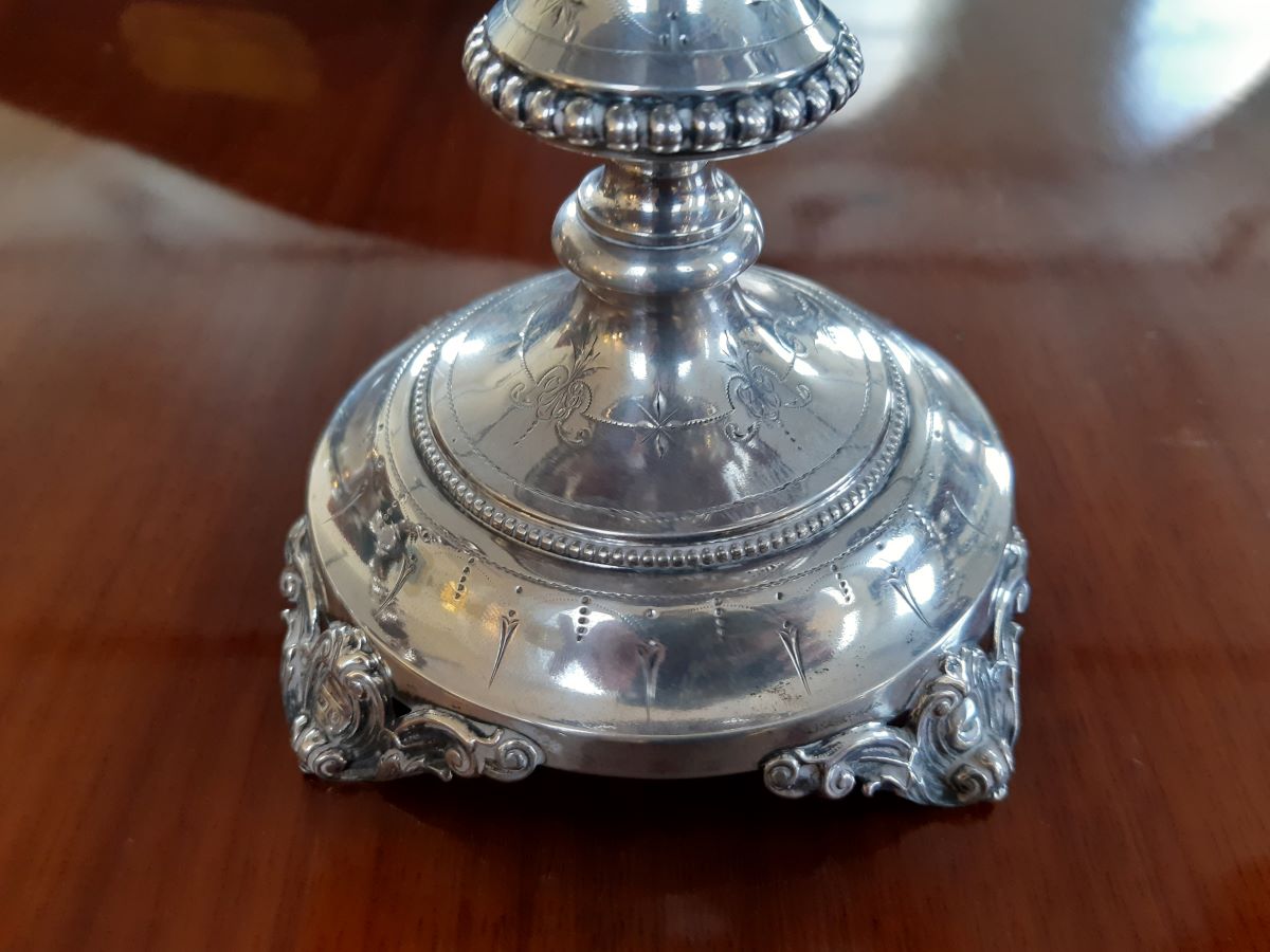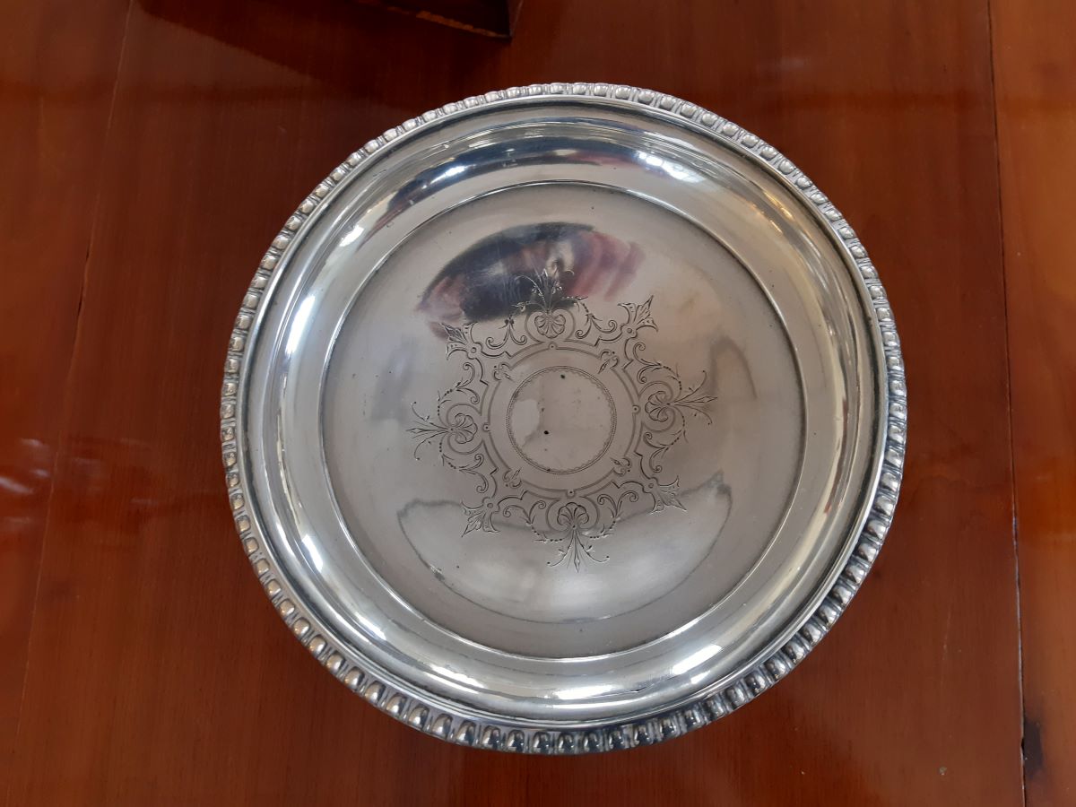 Here is a silver table centre fruit bowl with beaded edge and engraved decoration. Indistinct hallmarks. 8'' diameter.