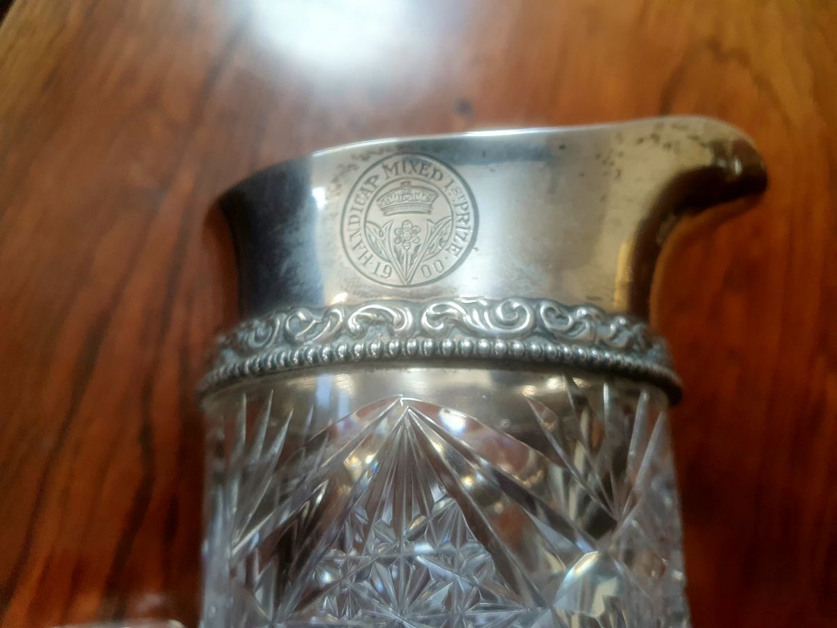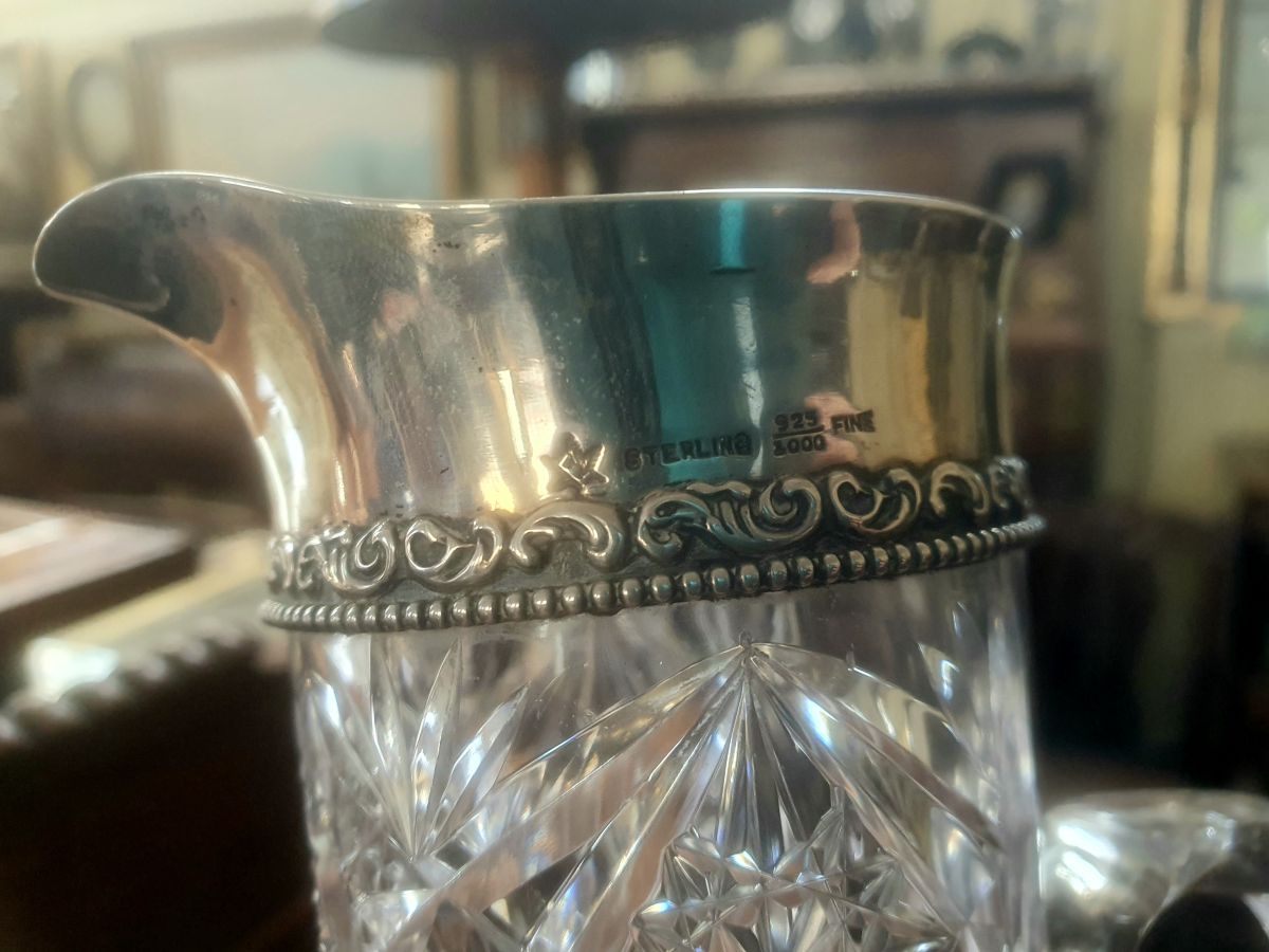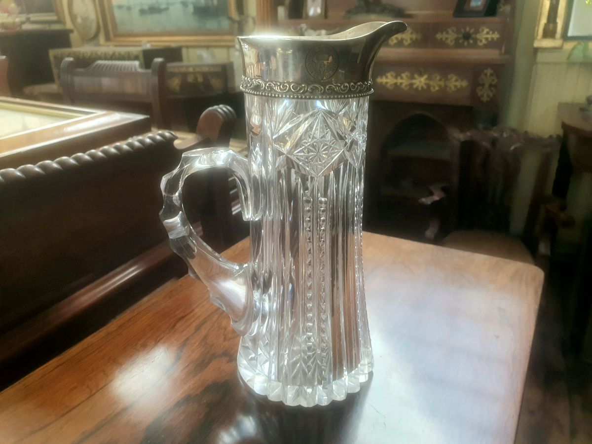 A fine quality cut-glass jug with sterling silver rim, date 1920, 8'' high.
