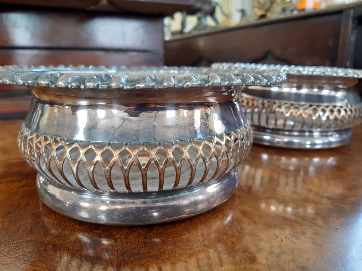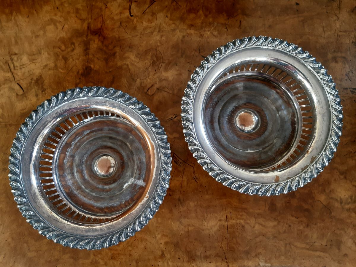 Here are a pair of silver plate, on copper, bottle coasters.