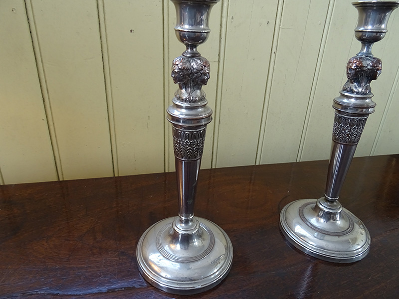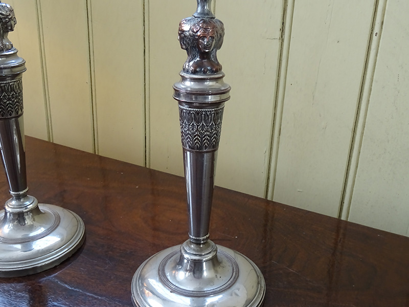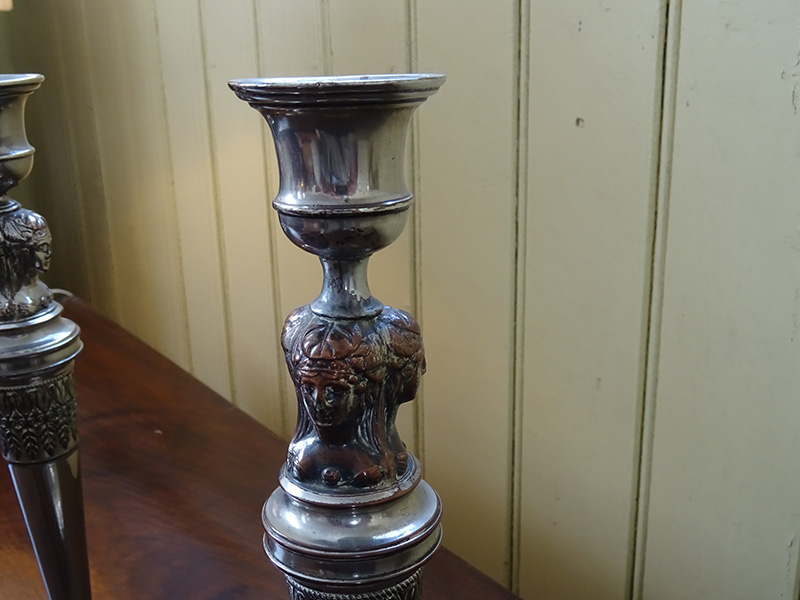 Here are a pair of fine silver plate on copper candlesticks from the 19th. century. Good condition. Measure 12 inches tall.