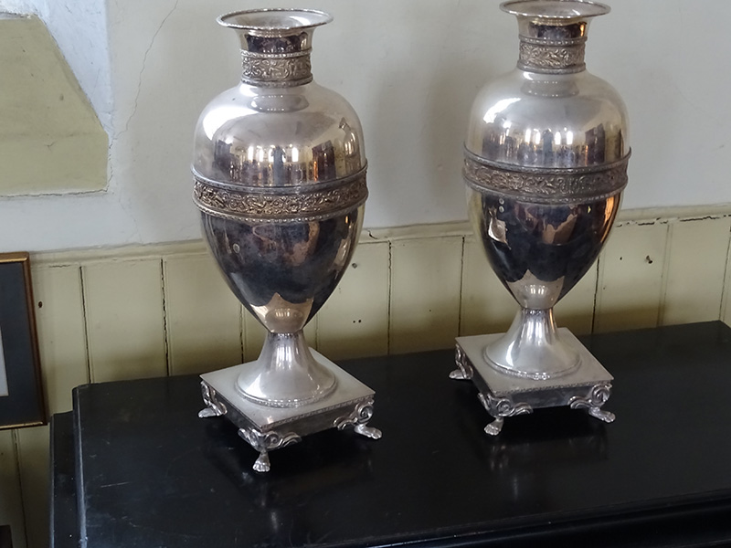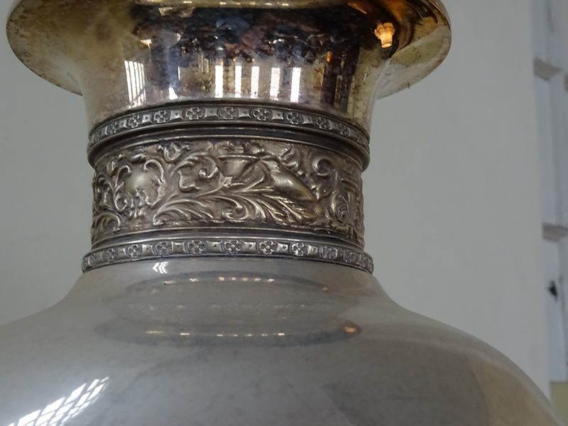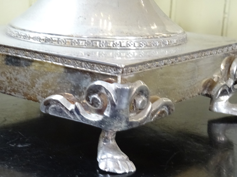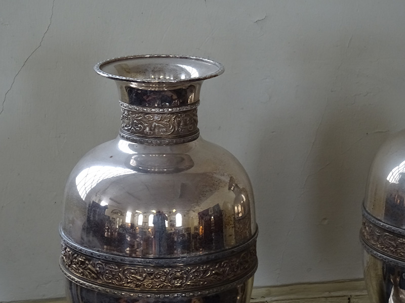 Here a good pair of large antique silver plate urns in the classical style, measure 21 inches high, good condition.