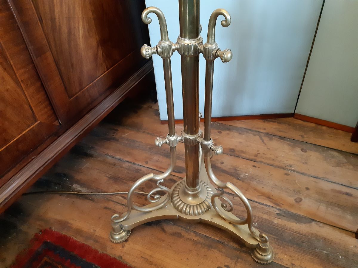 Here is a good quality cast brass lamp standard, formerly an oil lamp, telescopic, could be made by W.A.S Benson. Heavy and base measures 19'', max height 6' without shade.