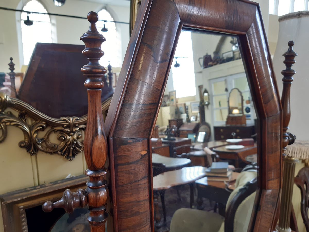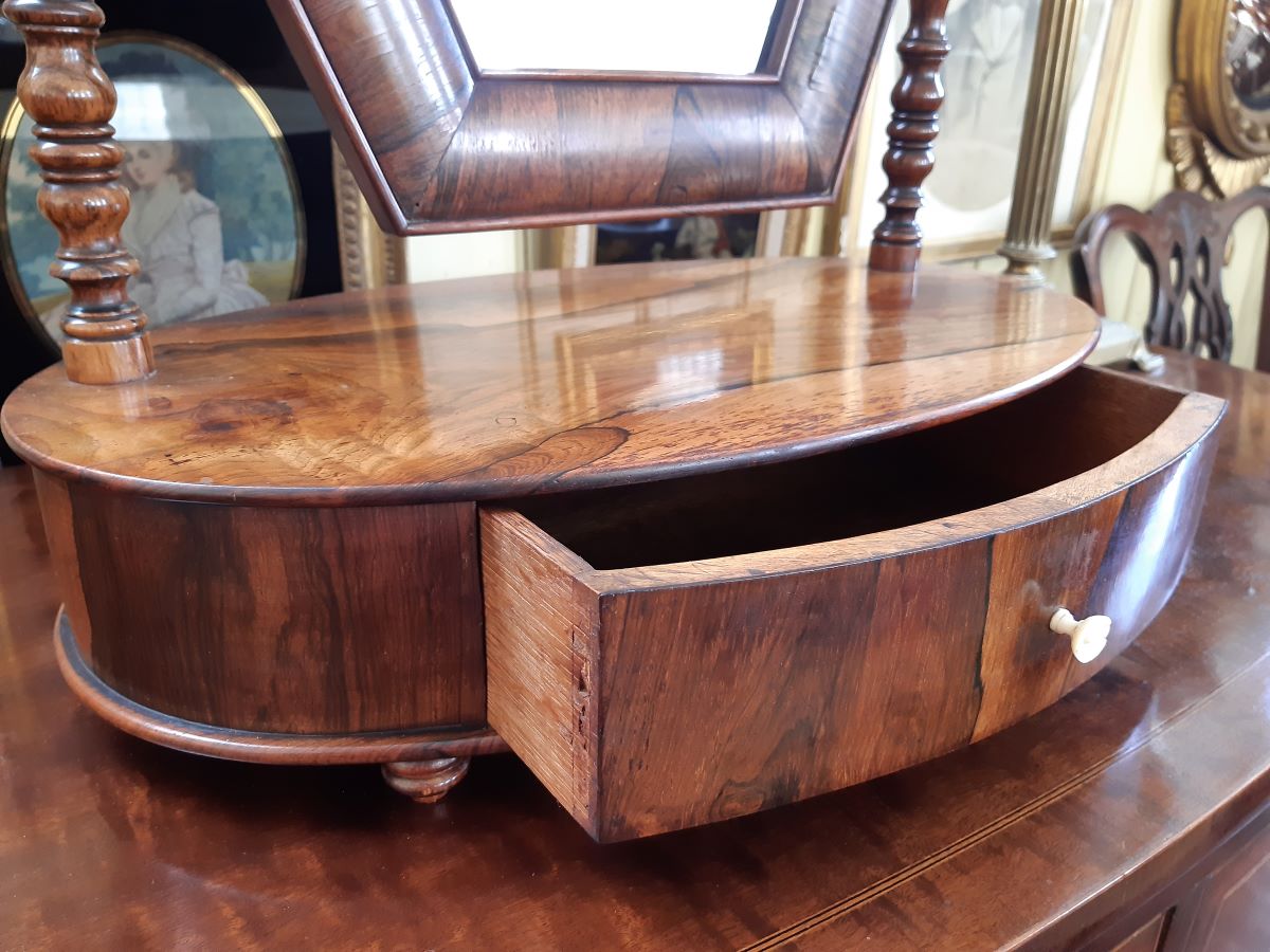 Here is a rosewood barrel-shaped swing toilet mirror with drawer. Measures 19'' wide & 28'' high.