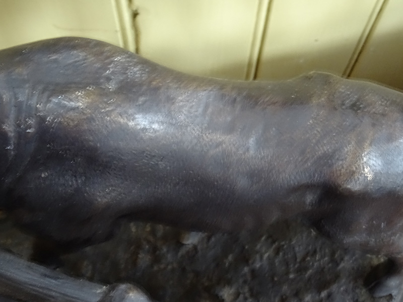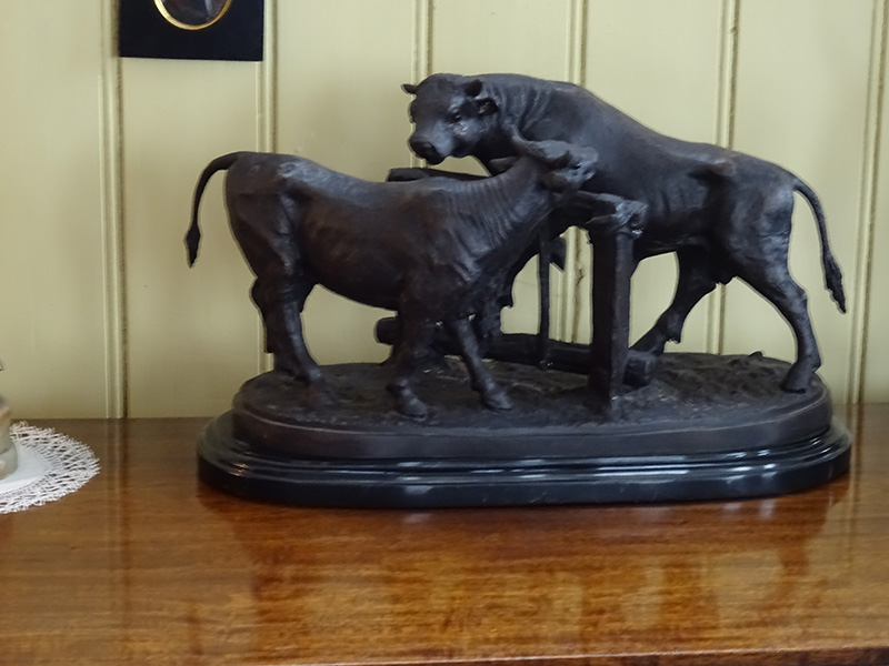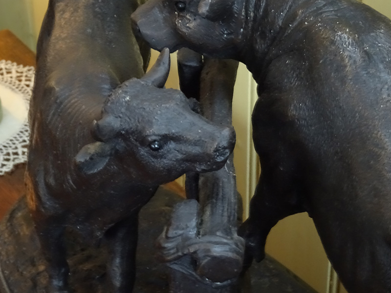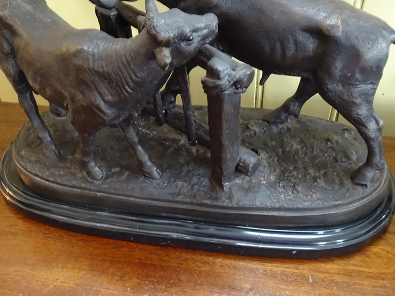 Here is a good bronze sculpture of a cow and bull standing by a gate. Cast in the early years of the 20th. century. The marble base is 20 inches long. This bronze is very heavy.