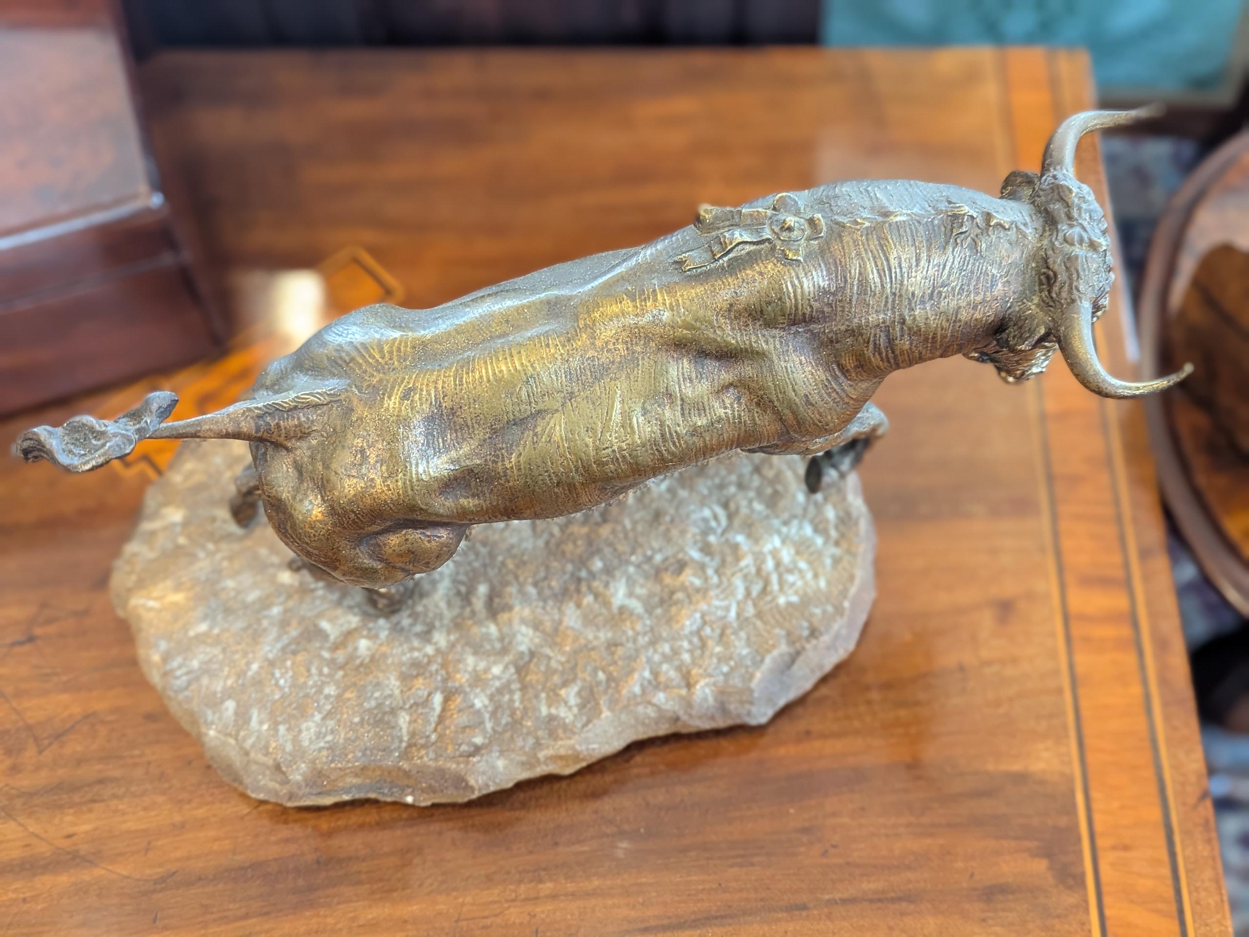 • Late 19th Century Gilt Bronze Charging Bull On Stone Base