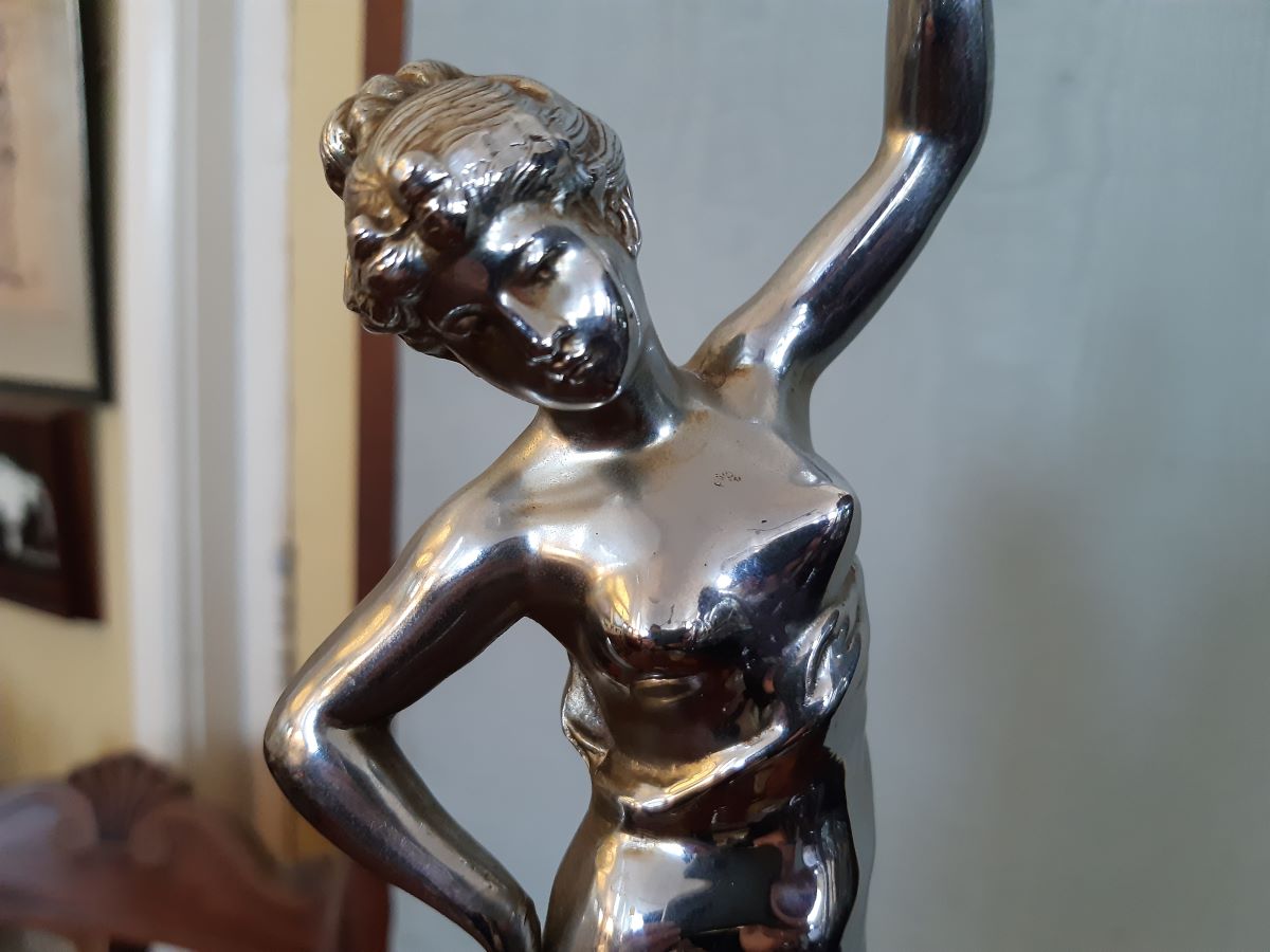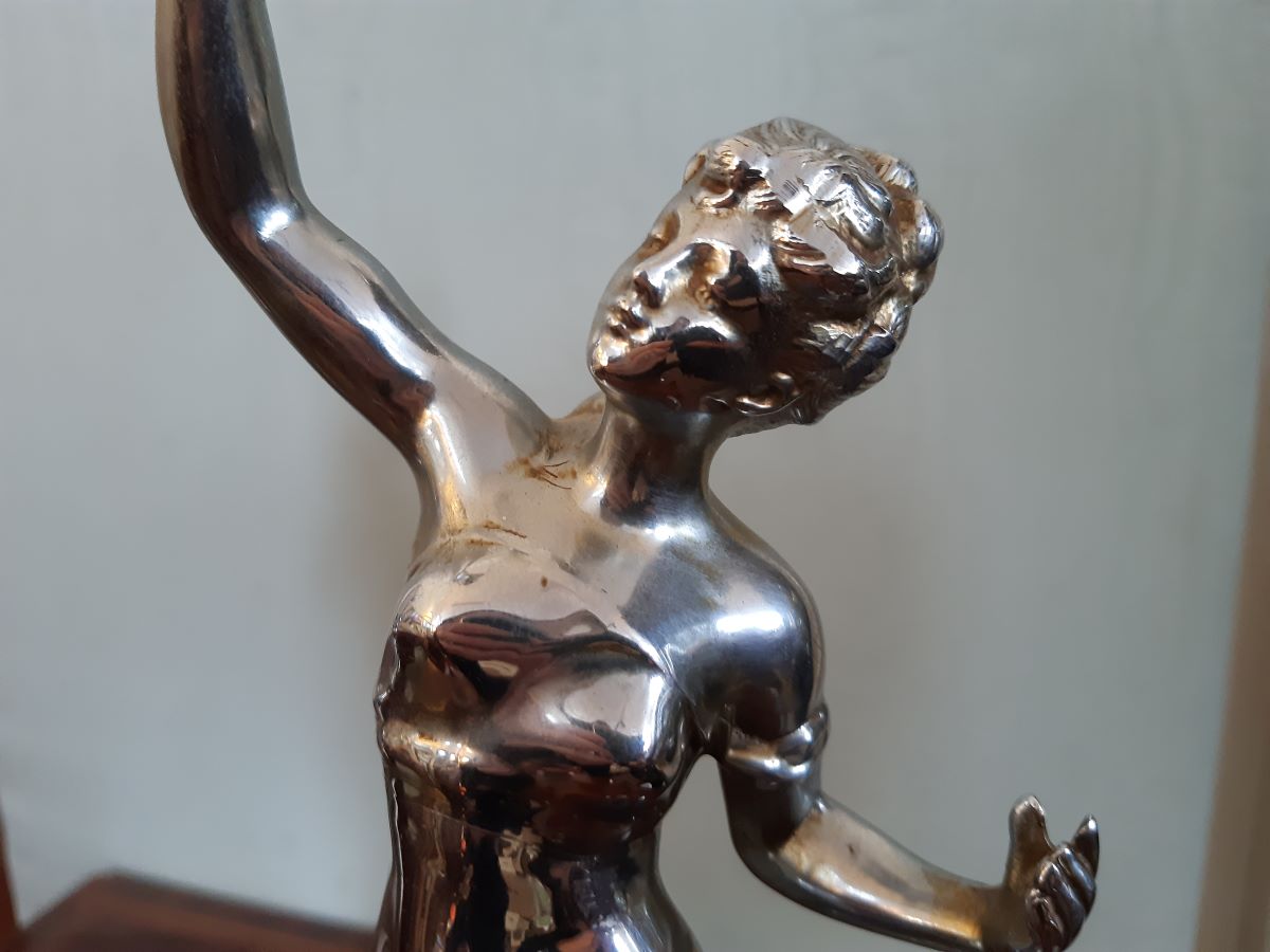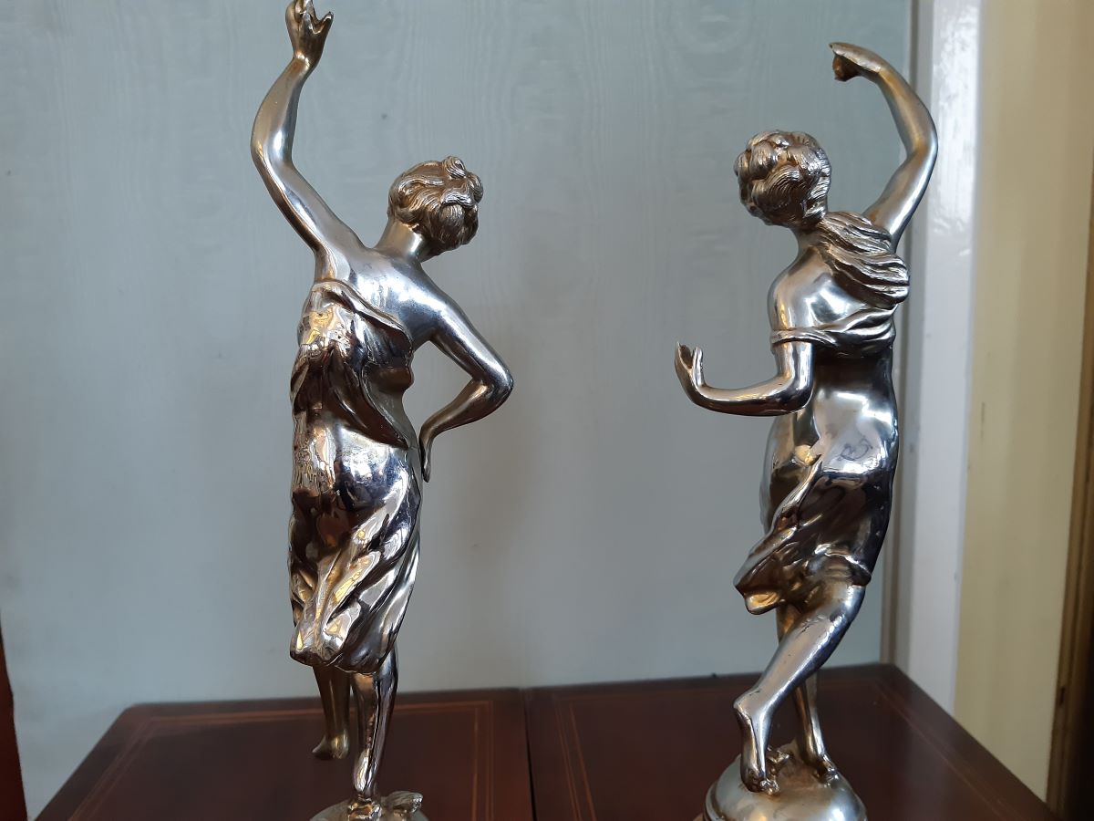 Here are a pair of chrome plate dancing girls standing on onyx bases, from the Art deco period they stand 13½'' high.