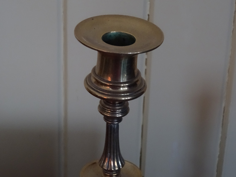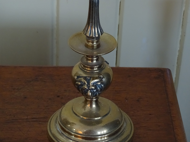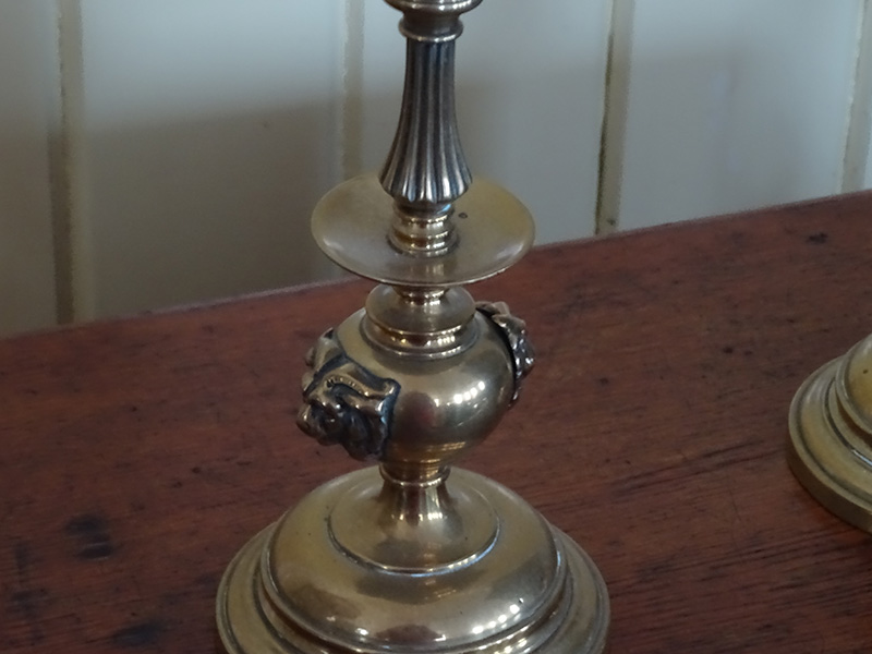 Here are a pair of 19th. century brass candlesticks with lion mask decoration and drip trays. Measure 8.25 inches high.