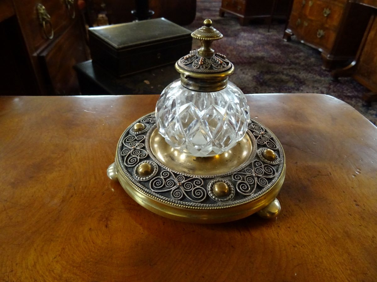 Here is a good quality bronze 4-piece desk set, comprising a pair of candlesticks, pen holder and cut glass ink well. All in excellent condition.