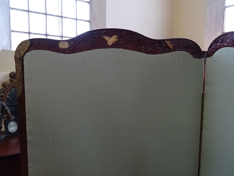 Here is a Chinese carved hardwood framed 4 fold draught screen. Grass and bone decoration and upholstered panels. Measures 5'9'' high, each panel is 2' wide. Good condition.