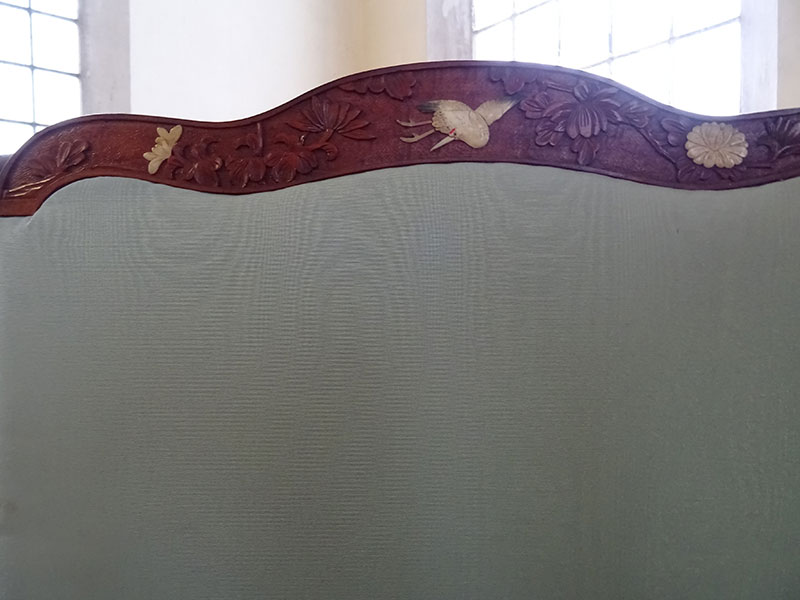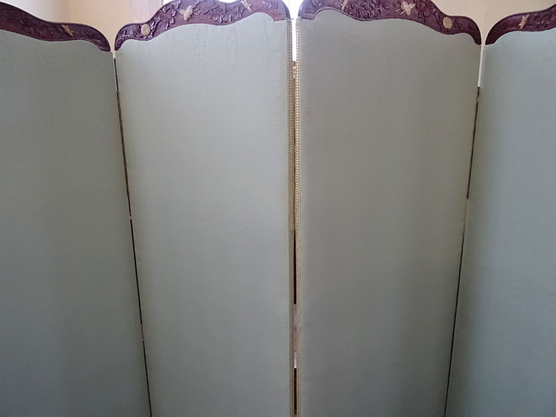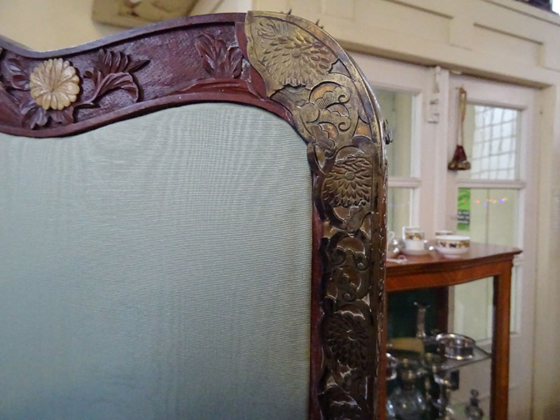 • Chinese carved 4 fold draught screen, upholstered panels