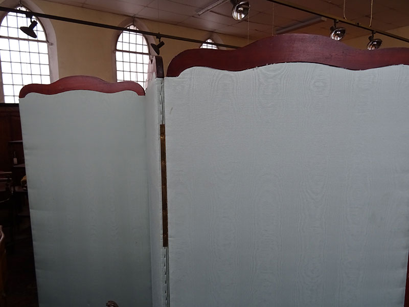 Chinese carved 4 fold draught screen, upholstered panels