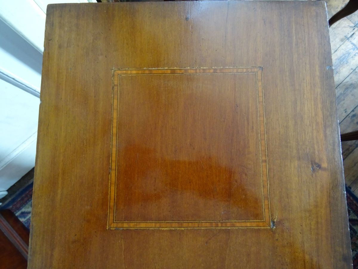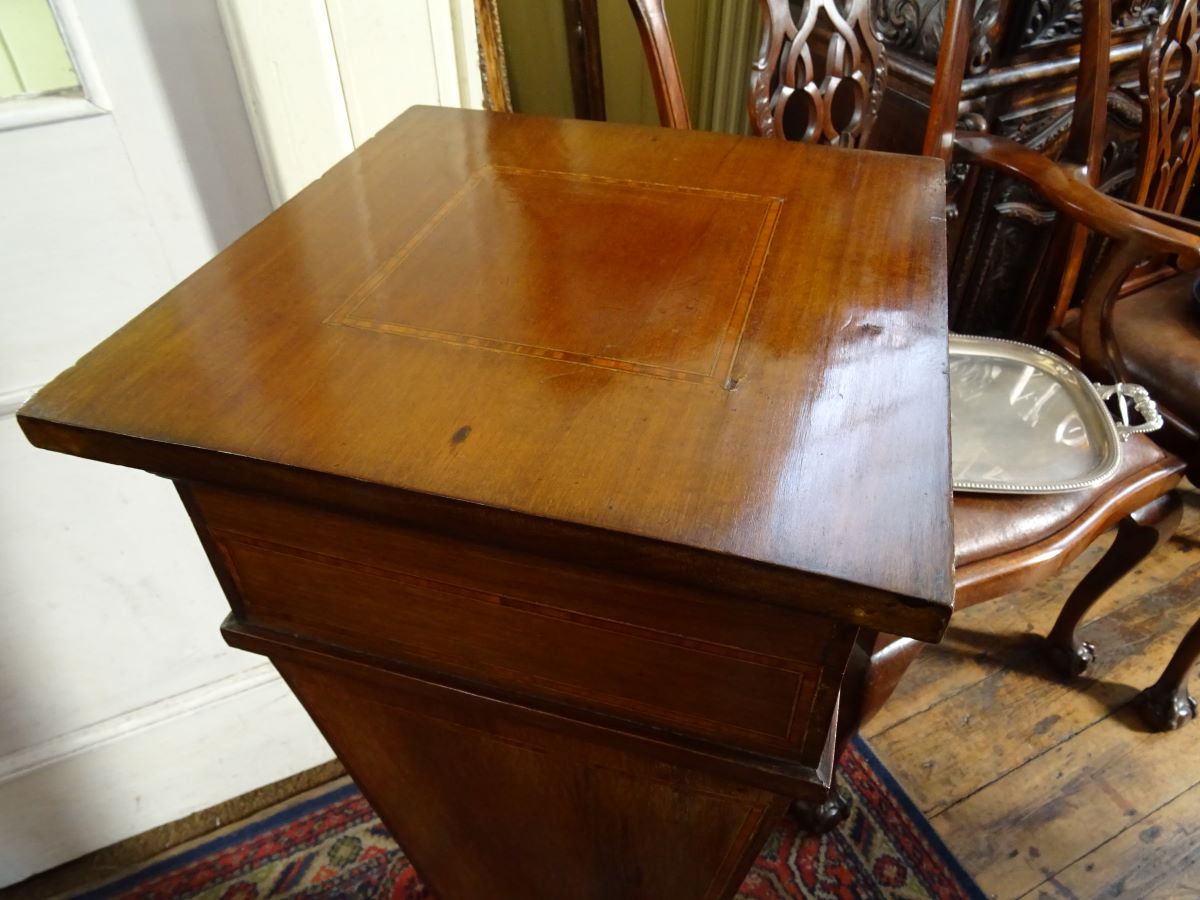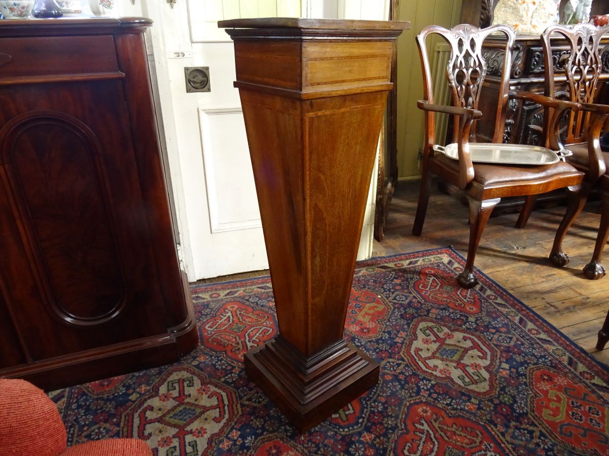 Here is a good mahogany pedestal from the early 1900's, inlay on pedestal and top. Measures 41'' high and top 12'' square. Good condition.