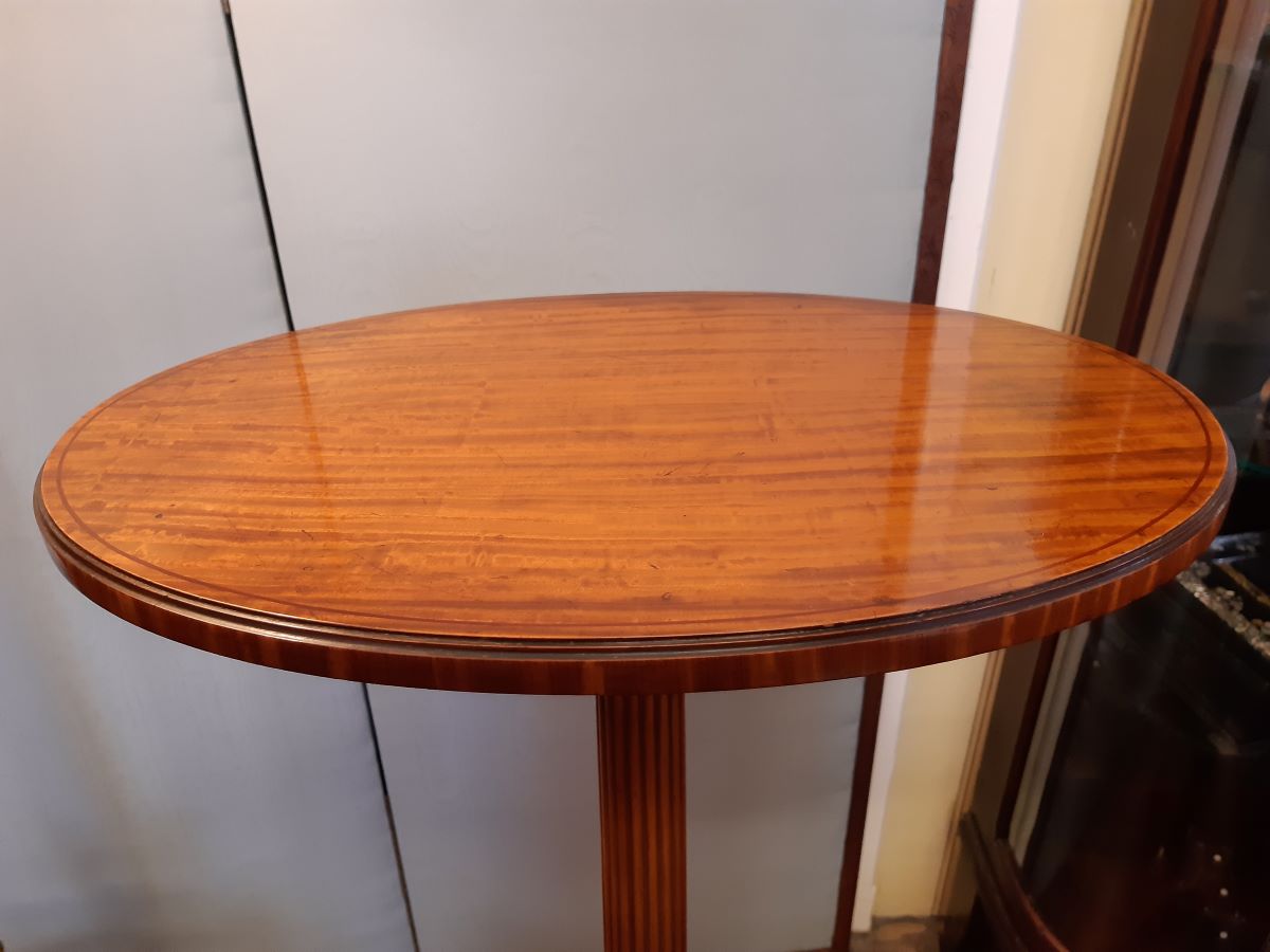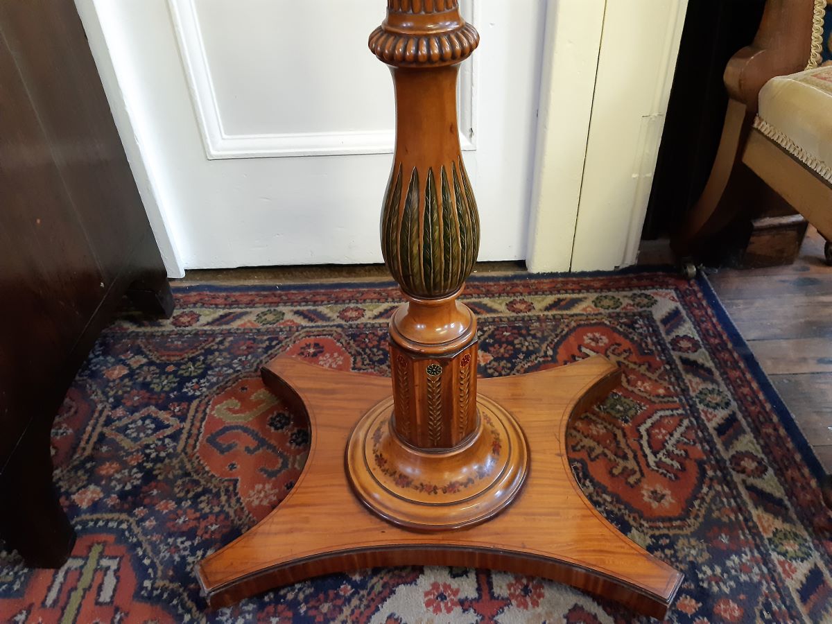 Here is a fine quality satinwood pedestal, the carved and fluted centre column having painted leaf and floral designs on shaped platform base. Top measures 18'' across, overall height 42''.