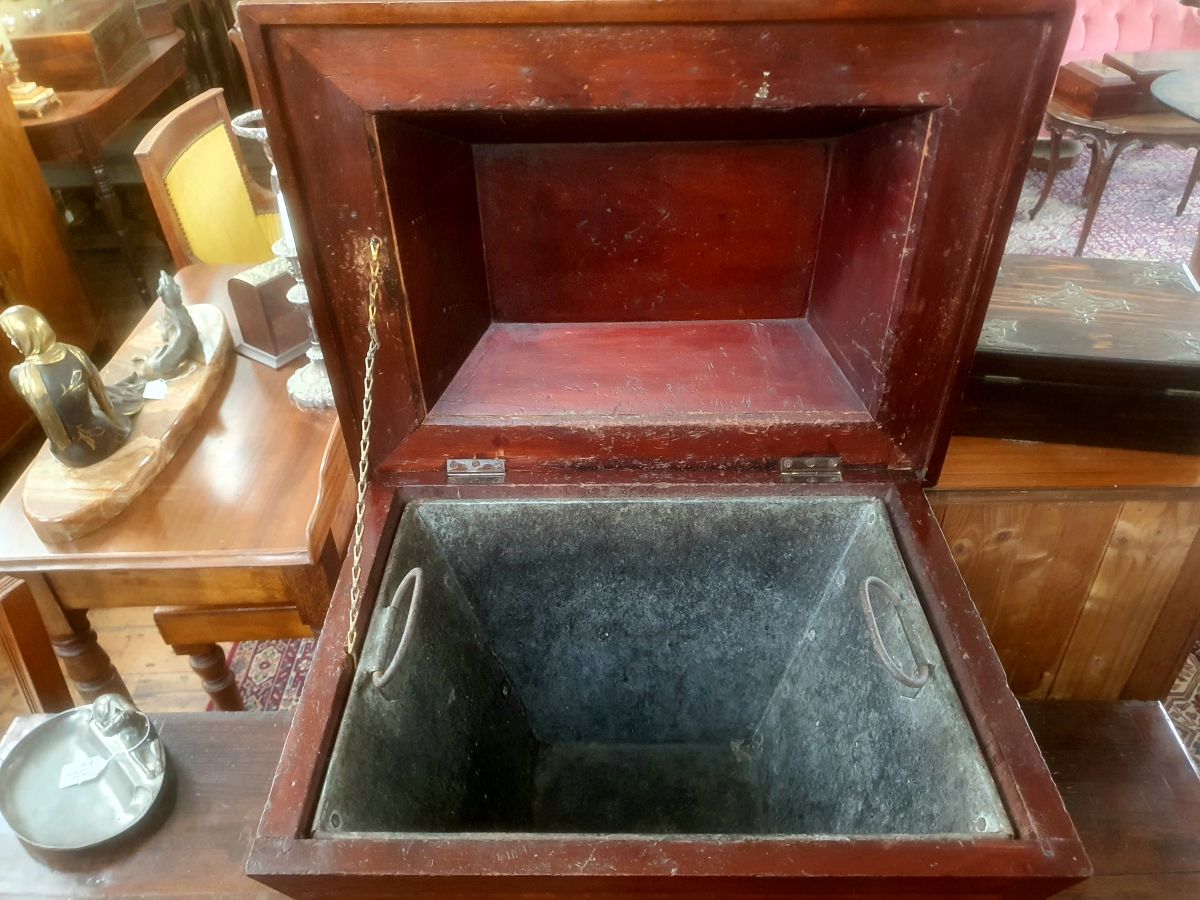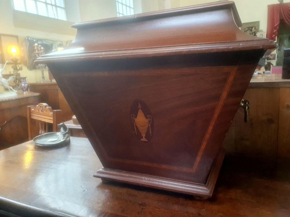 Rectangular form with shaped hinged cover, inlaid decoration and brass swing handles. Complete with liner. Measures 20''(at top) x 17'' high, 12'' at base.