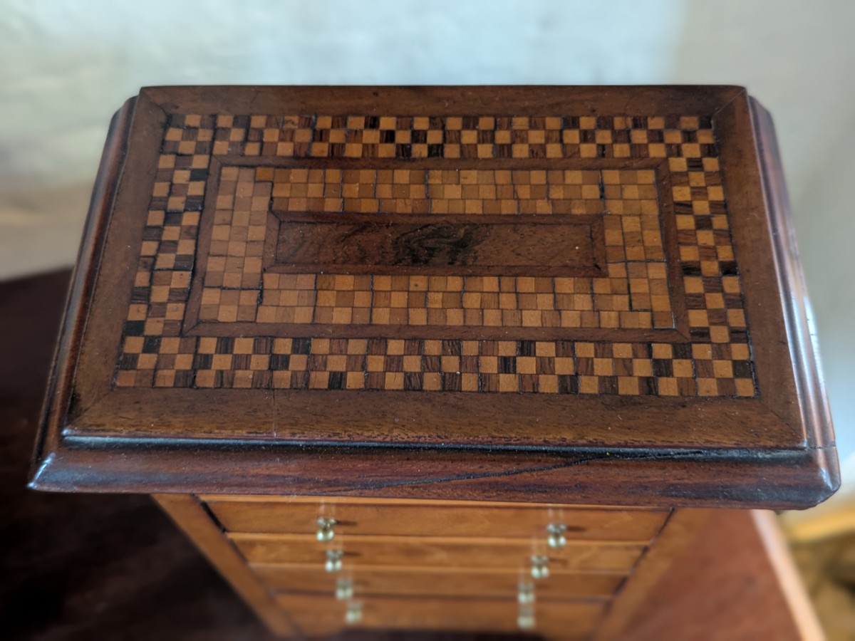 Here is a small Victorian table top jewel chest of 4 drawers, with inlaid parquetry decoration. Measures 8 ¾'' wide x 12'' high.