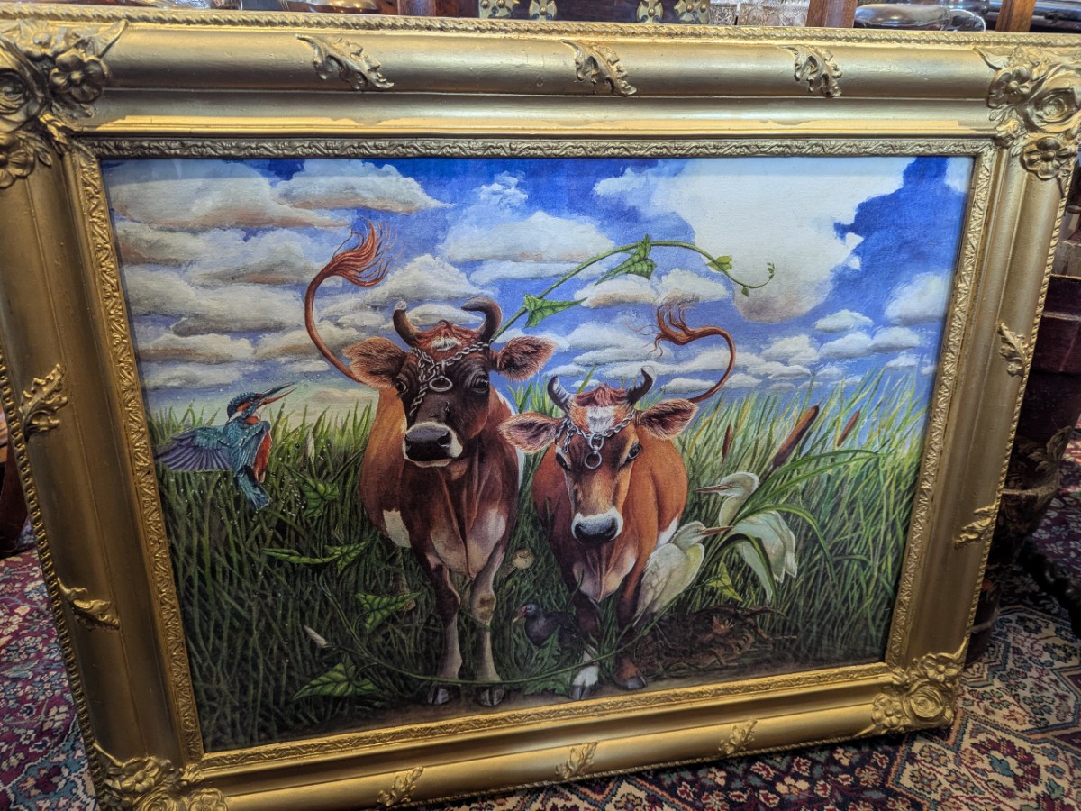 Signed giclee print from an original watercolour and gouache painting by Clare McFarlane. Painted from photographs of Jersey cows wearing chains on their heads taken at a farm gate in Trinity, Jersey in 1996. The gilt gesso frame is French 18th Century.