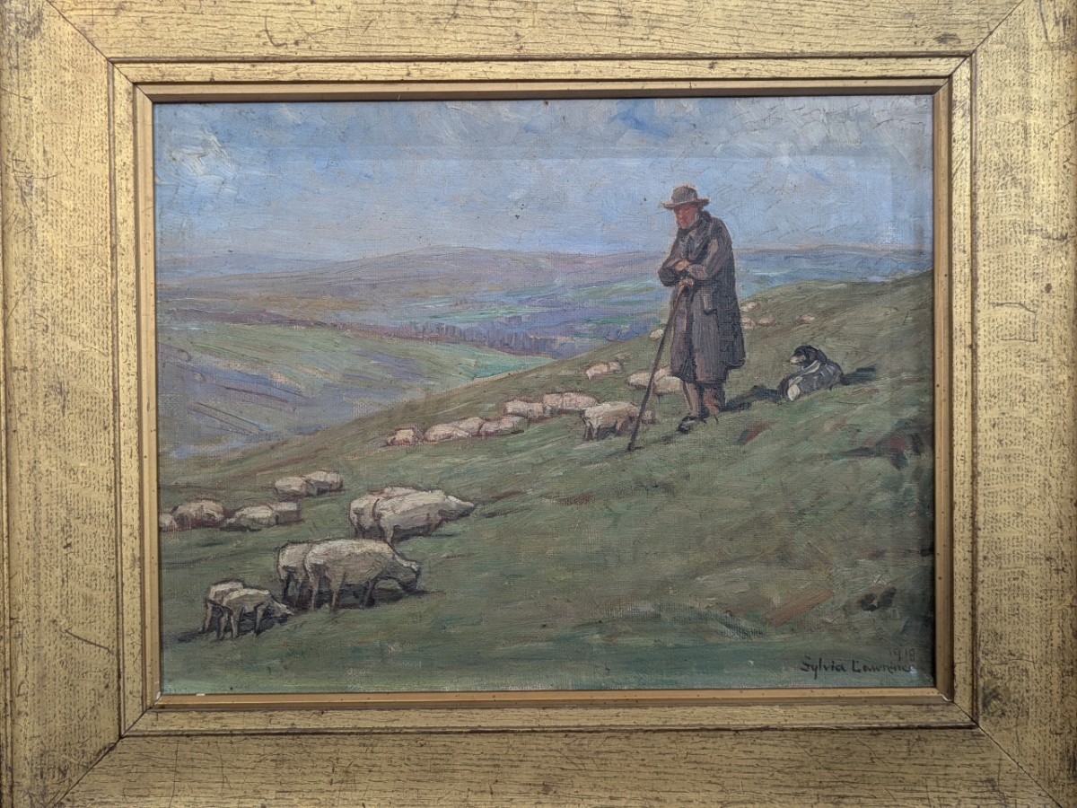 • Sylvia Lawrence, Oil On Canvas-Sheep & Shepherd On Hillside